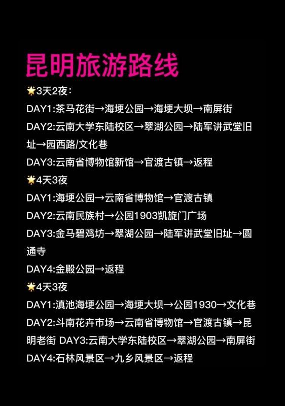 DAY 1:滇池海埂公园→海埂大坝→公园1930→文化巷DAY 2:斗南花卉市场→云南省博物馆→官渡古镇→昆明老街DAY 3:云南大学东陆校区→翠湖公园→南屏街DAY 4:石林风景区→九乡风景区→返程