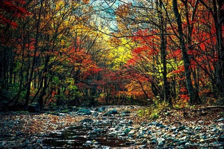 太阳升起,五彩世界被照耀的一片金黄。在到达敦化以前的G201都非常美,路况也不错。到达道岭隧道的时候,我们看到了一片此程最美的枫树林。 道路两边都是金色的玉米田,黑色的柏油路穿行其中,惬意之极。整个景区延绵几十公里,已经开发的景点收费景点包括庆岭瀑布,谷中谷,谷外谷。