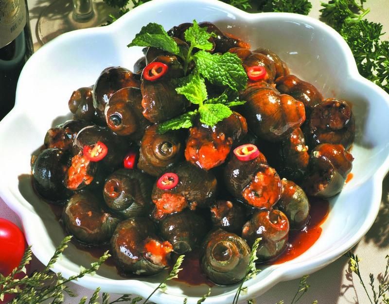 阳朔有“十八酿”,田螺酿、豆腐酿、柚皮酿、竹笋酿、香菌酿、蘑菇酿、南瓜花酿、蛋酿、苦瓜酿、茄子酿、辣椒酿、冬瓜酿、香芋酿、蒜酿、蕃茄酿、豆芽酿、油豆腐酿、菜包酿等等。其中最好吃的是田螺酿,田螺酿的馅料略有不同,是用切碎的瘦肉和田螺肉拌在一起,加入薄荷叶和少许当地特产三花酒,塞入洗净的剪过尾巴的田螺壳里,最后下到锅里炒熟。一盘田螺酿,好像咀嚼过一段风情万种的旧日时光,回味无穷。