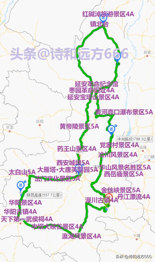 如果不想环全陕西省自驾游或者假期时安排不来的话,也可以考虑下图中的陕西自驾小环线游: