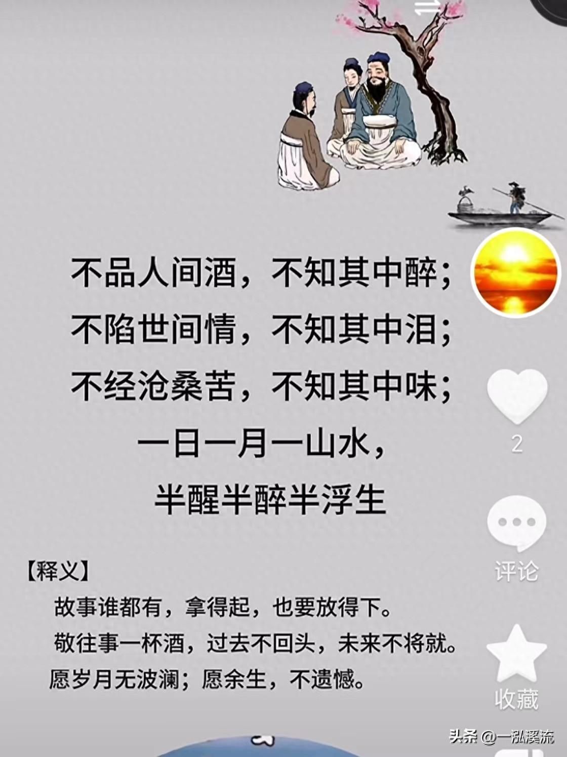 “不品人间酒,不知其中醉:不陷世间情,不知其中泪:不经沧桑苦,不知其中味:一日一月一山水,半醉半醒半浮生。”