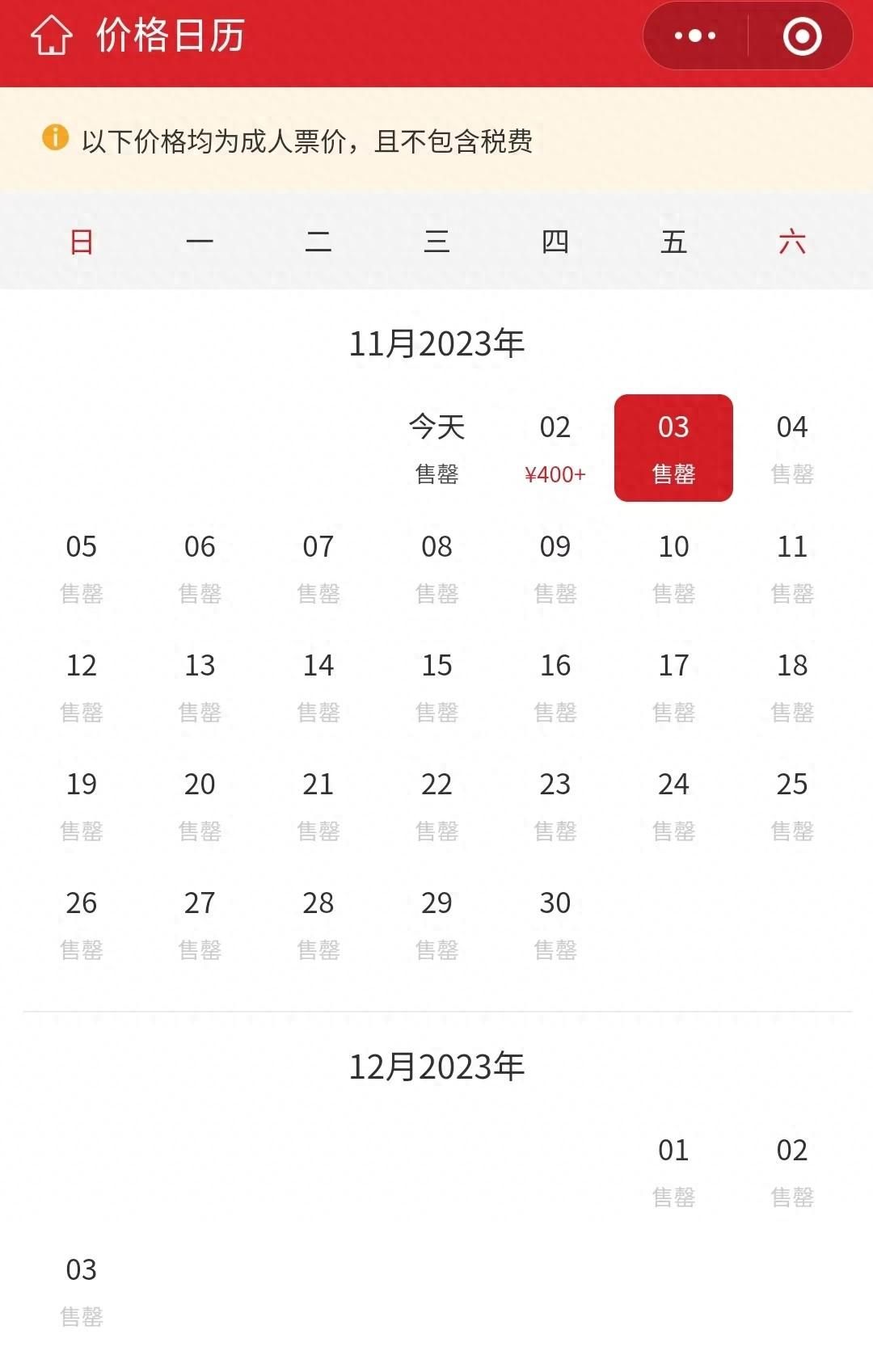 比如搜索桂林航空的桂林到济南航线,2日的价格在400到700元左右不等,但3号就显示“未能查询到符合条件的航班信息”,打开后续几天的“价格日历”,直到12月3日的航班均显示售罄。