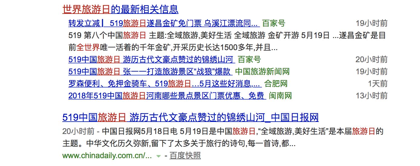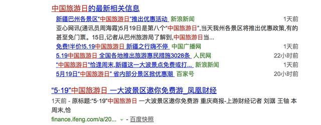 打开搜索引擎,搜索中国旅游日,或旅游日,世界旅游日等核心关键词,就会弹出不同类型的新闻事件,这些不能错过哦。