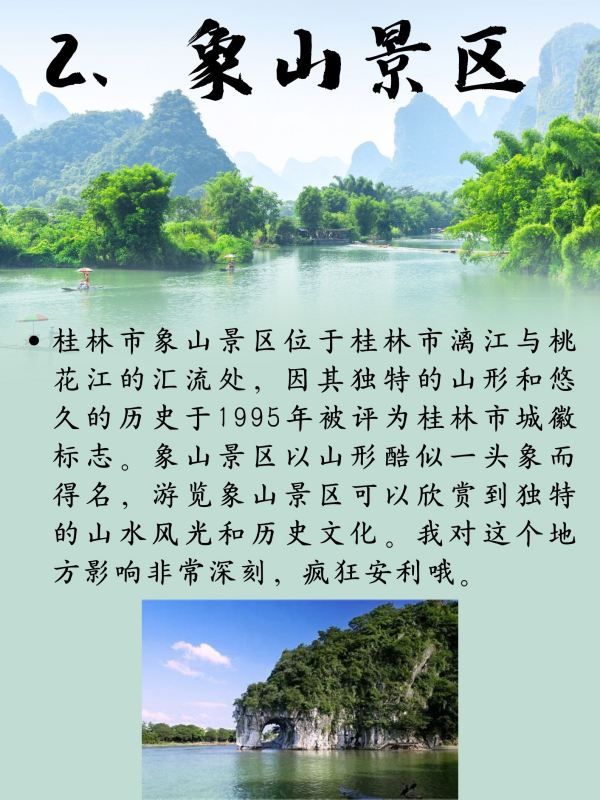 桂林市象山景区位于桂林市漓江与桃花江的汇流处,因其独特的山形和悠久的历史于1995年被评为桂林市城徽标志。象山景区以山形酷似一头象而得名,游览象山景区可以欣赏到独特的山水风光和历史文化。我对这个地方影响非常深刻,疯狂安利哦。
