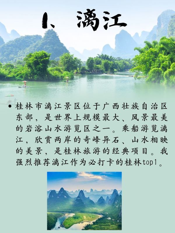 桂林市漓江景区位于广西壮族自治区东部,是世界上规模最大、风景最美的岩溶山水游览区之一。乘船游览漓江,欣赏两岸的奇峰异石、山水相映的美景,是桂林旅游的经典项目。我强烈推荐漓江作为必打卡的桂林top1.