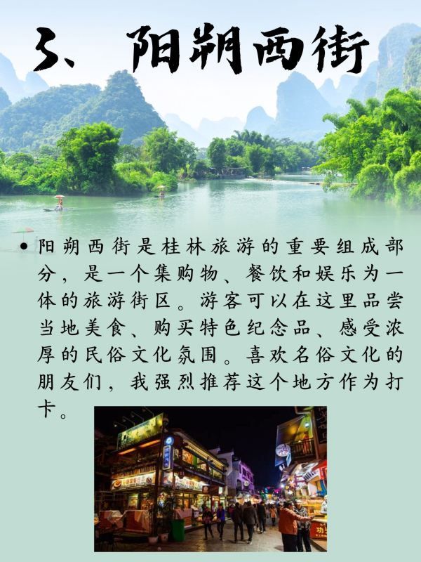 阳朔西街:是阳朔县的一条古老而充满活力的街道,可以品尝美食、购物、观赏夜景等。