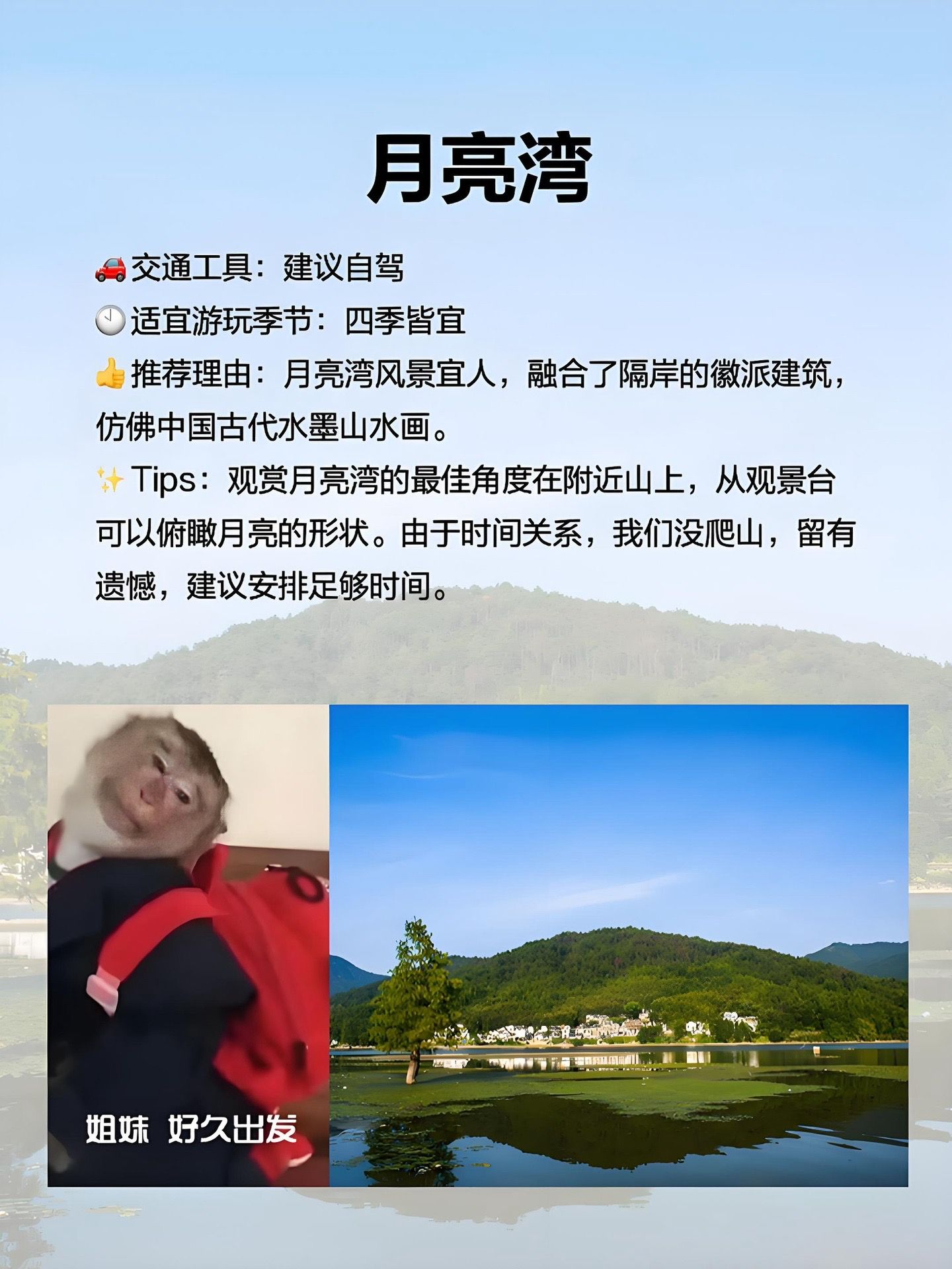 观景台在附近的山上,爬上去可以看到月亮湾的全貌,像一幅水墨画一样美到不行~