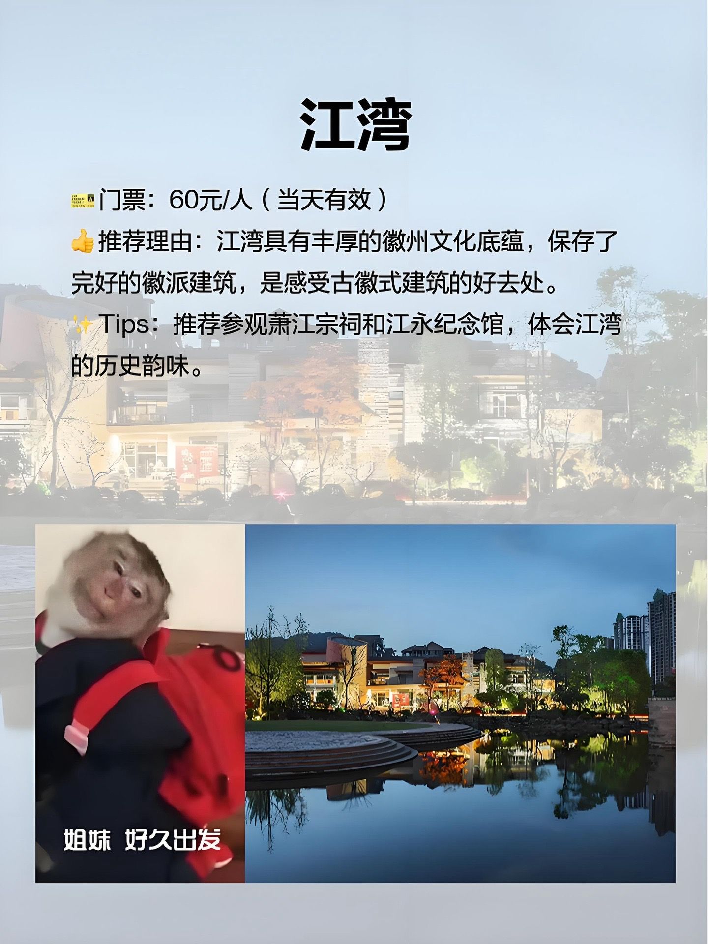 推荐游玩打卡点:萧江宗祠、百工坊、后龙山等,还可以去江永纪念馆了解一下英雄历史哦!