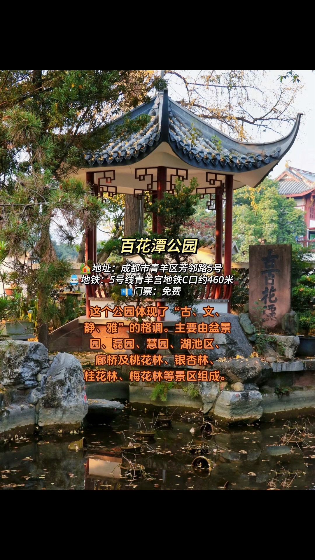 ·百花潭公园:地址:成都市青羊区芳邻路5号,地铁:5号线青羊宫地铁C口约460米。这个公园体现了"古、文、园、磊园、慧园、湖池区廊桥及桃花林、银杏林、桂花林、梅花林等景区组成。它是明清两代为纪念唐代女诗人薛涛而先后建起来的,因薛涛一生爱竹,后人便在园中遍植各类佳竹,配上茅屋特别有诗意。