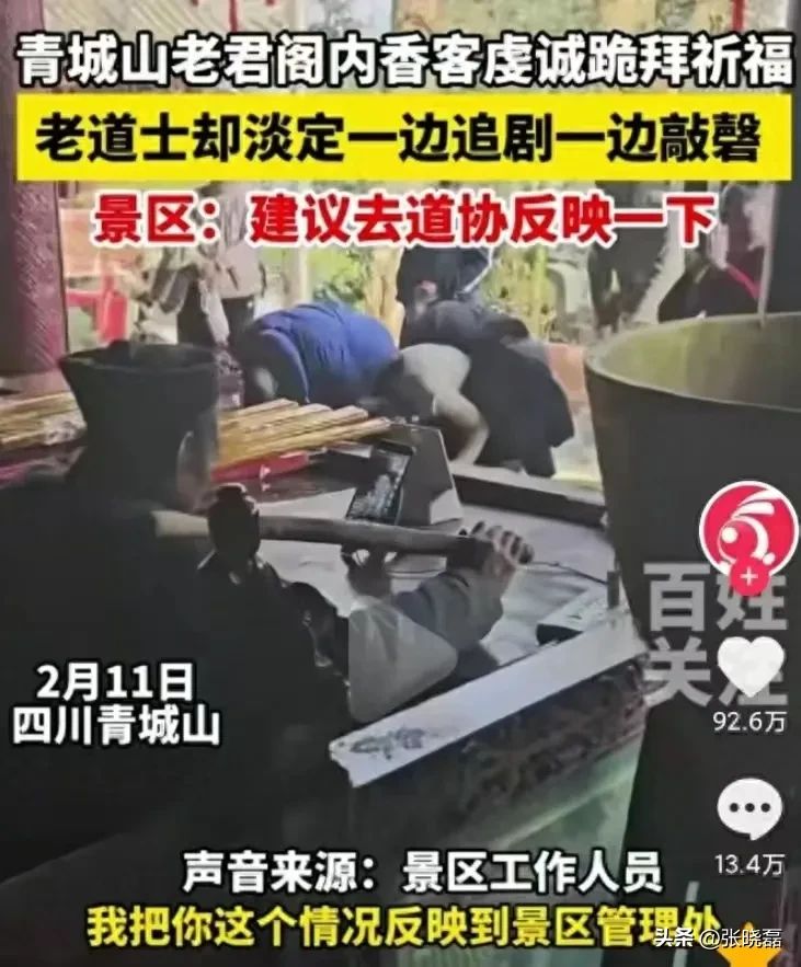 视频中,香客们虔诚地跪拜,而老道士则淡定地敲着圆磬,但他的目光并未完全集中在仪式上,而是不时地瞄向手中的手机屏幕。这一行为被一些网友视为对宗教仪式的不尊重。