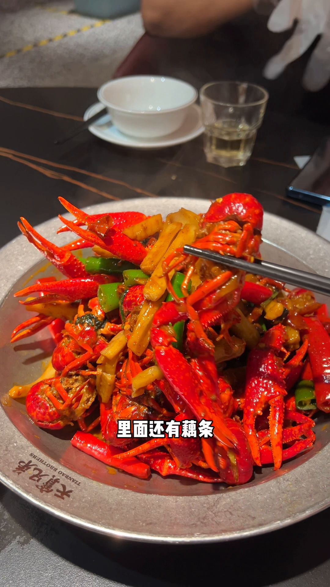 8. 来长沙不吃口味虾,等于白来。天宝兄弟,个人觉得非常好吃。罗氏虾个头也很 nice,口味虾疯狂打 call,里面还有藕条。沉浸式吃虾,肉质紧实且入味。你看这个虾膏,快吃完了,加份面拌在里面,裹满汤汁。今日第四杯饮料。