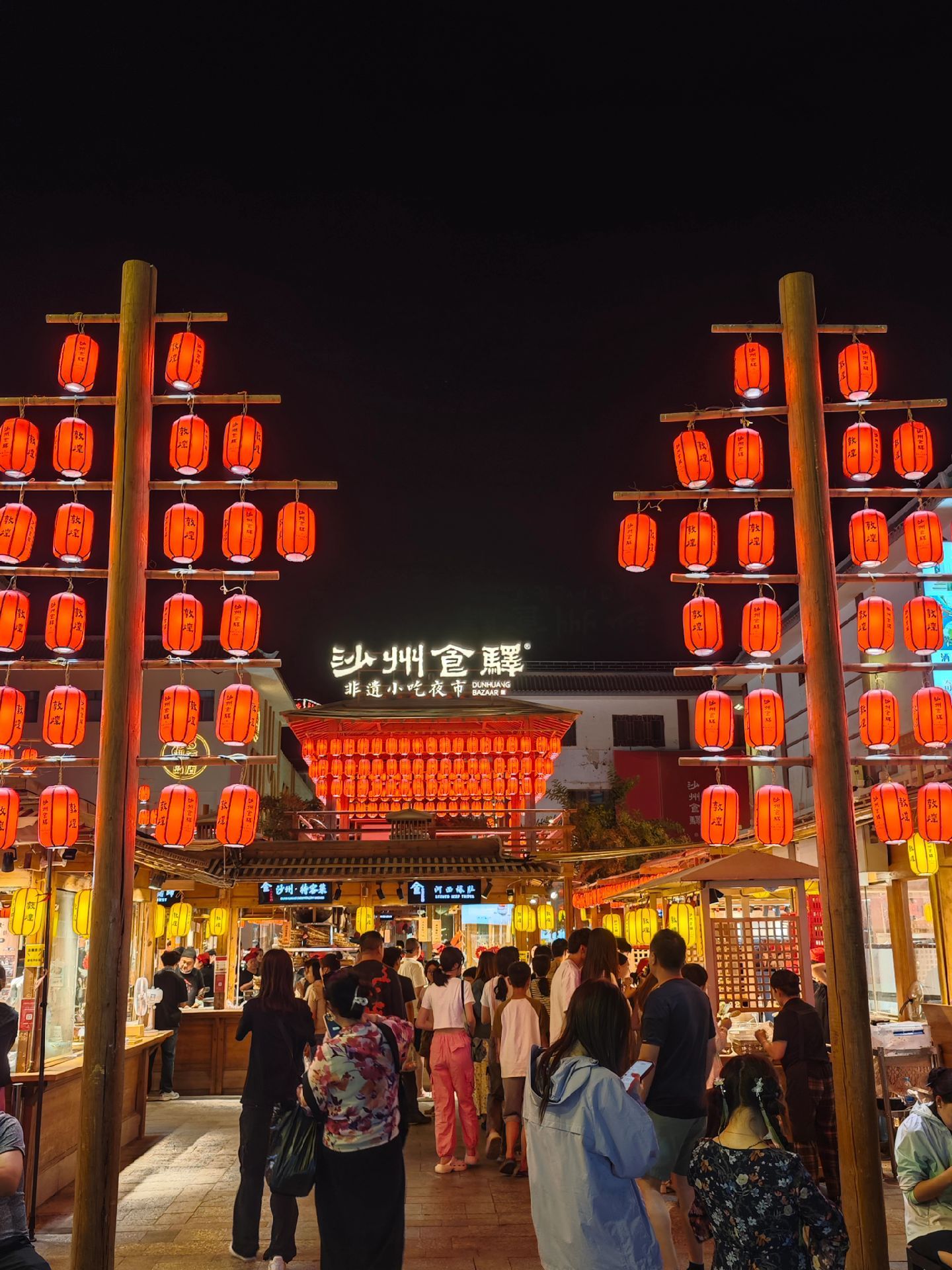 首先敦煌夜市和沙洲夜市其实是同一个地方,只是叫法不同而已。敦煌夜市规模很大,如果想要直奔各种美味小吃,比较推荐的是中心区域的沙洲食驿非遗小吃夜市,统一规划的摊位整整齐齐,嘈杂的叫卖声,喧闹的人群,悬在各处的红灯笼,