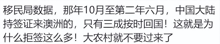 其中一个原因是澳洲移民局公布的数据:只有三成的持签证来澳洲的中国大陆游客按时回国。这个数据导致澳洲对中国游客的旅游签证驳回率暴增,很多符合条件的签证申请人因此被拒。