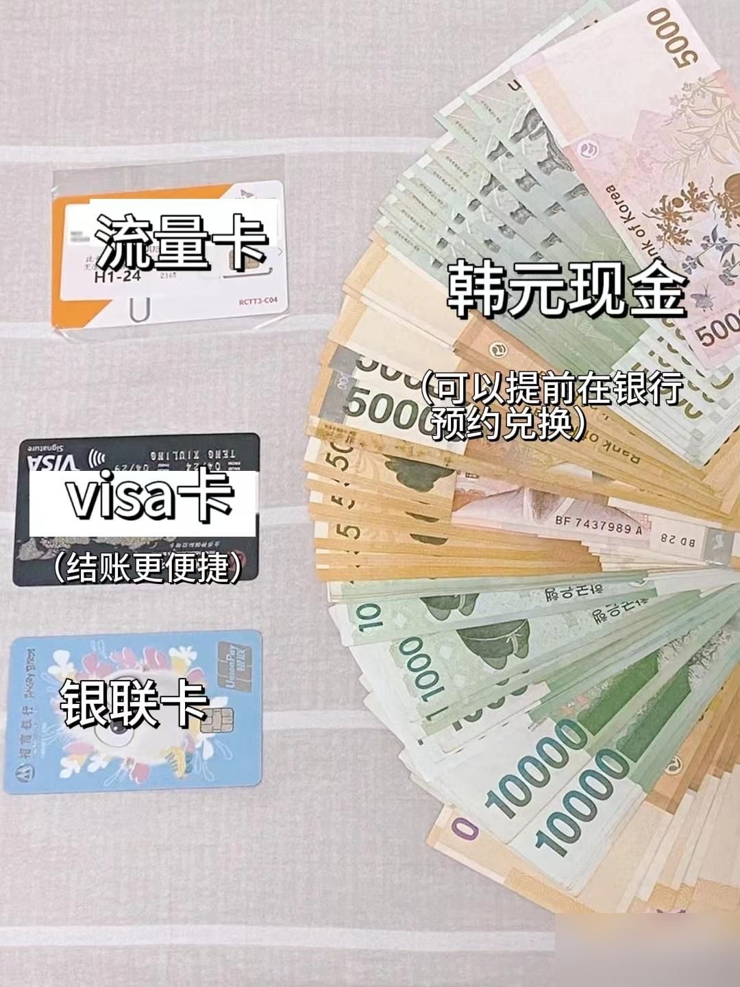 韩元现金(在中国银行或银行app购买韩国外汇,然后选择预约韩币取现·即可。要在出国前兑换,在韩国境内换汇率不是很划算。)