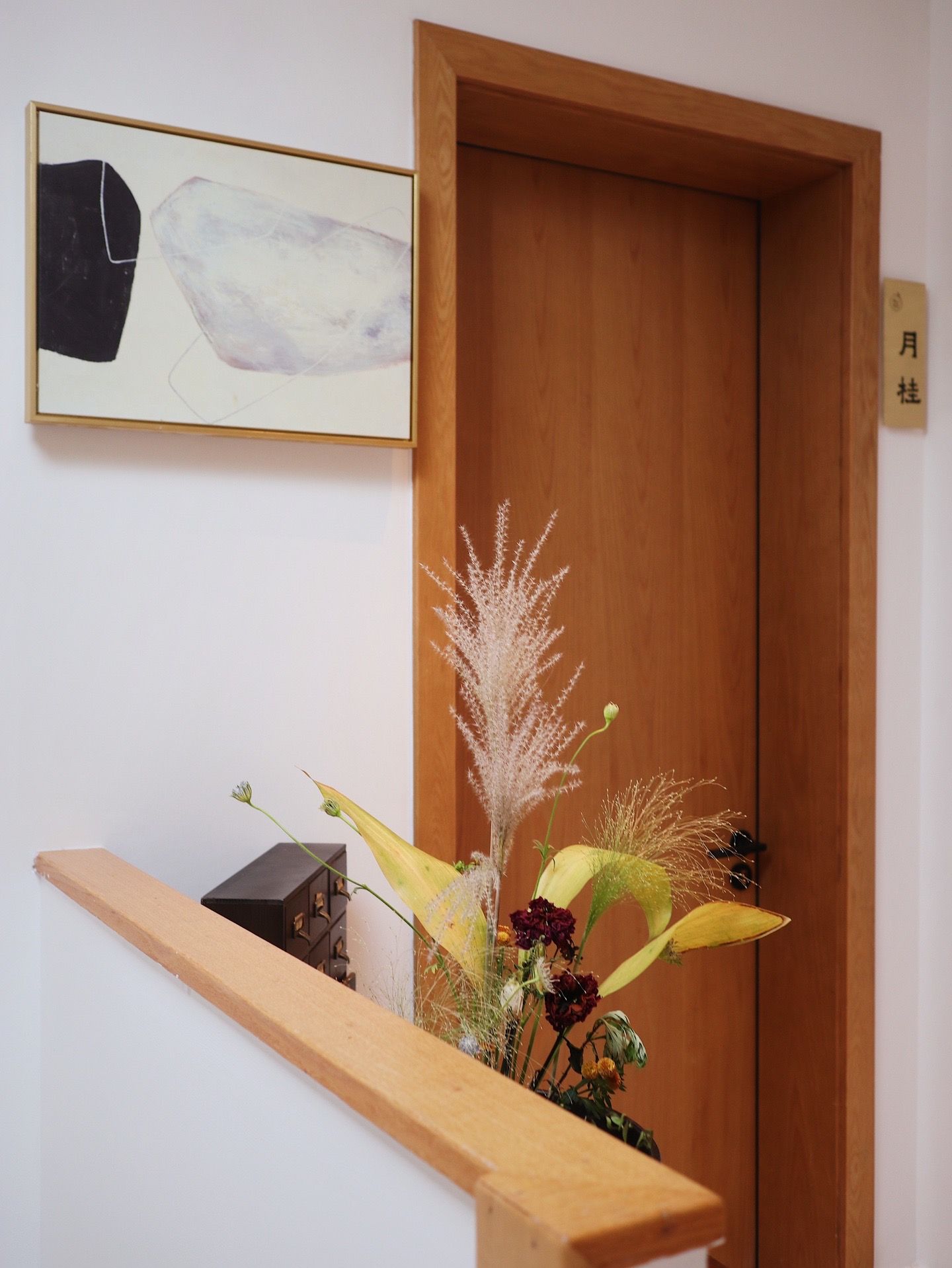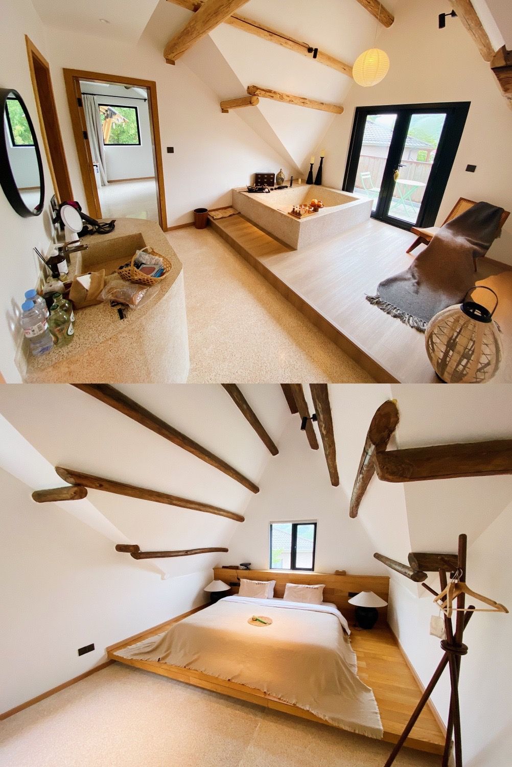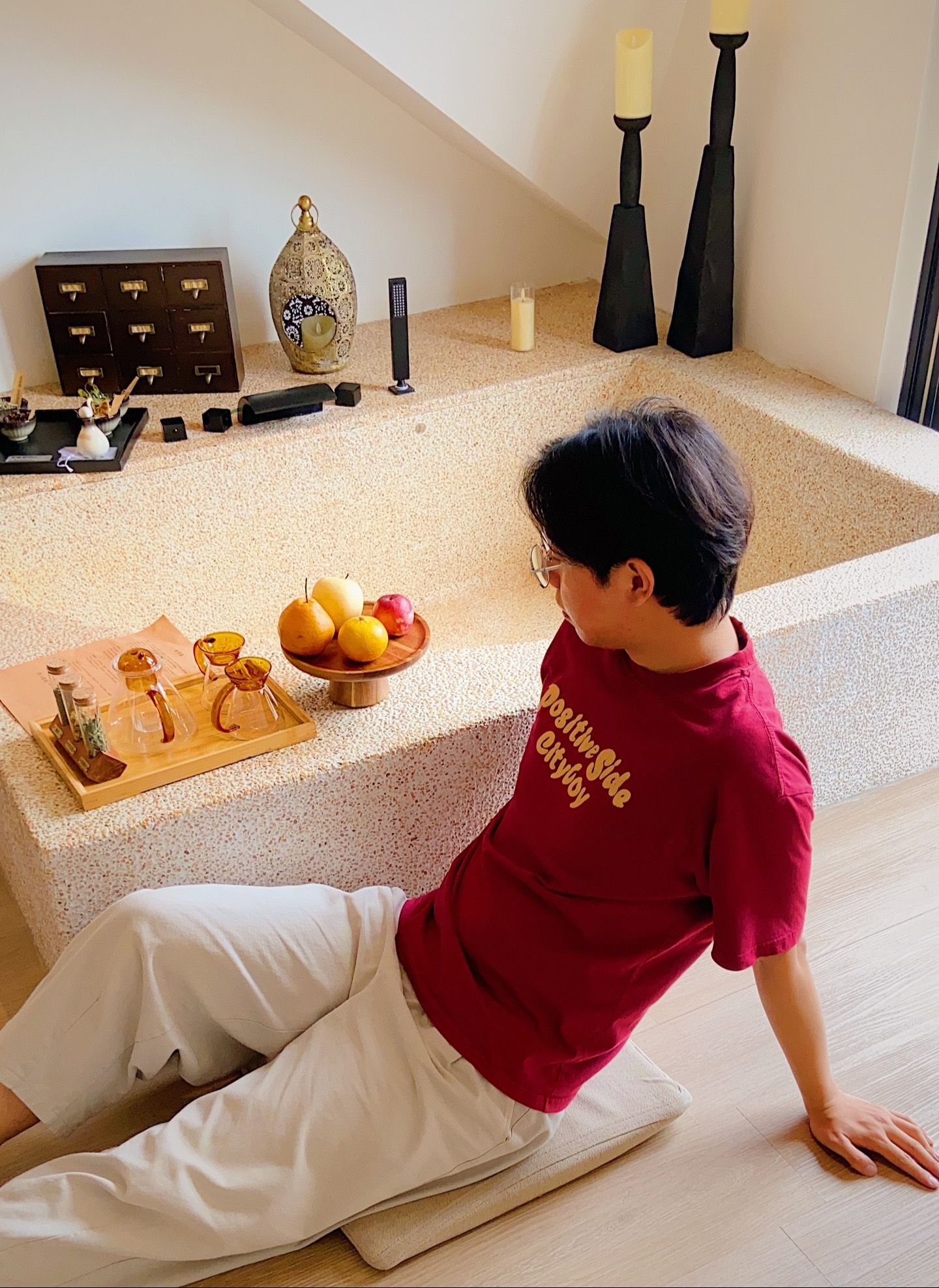 民宿共有十间客房,我这次入住的房间是位于3层的花烛·阳台私汤套房,面积足有45平方米,配备独立的私汤池,旁边摆放着下午茶、欢迎水果和在泡汤时可以加入池中的各种香料,整个屋内都充满了香草的香味。