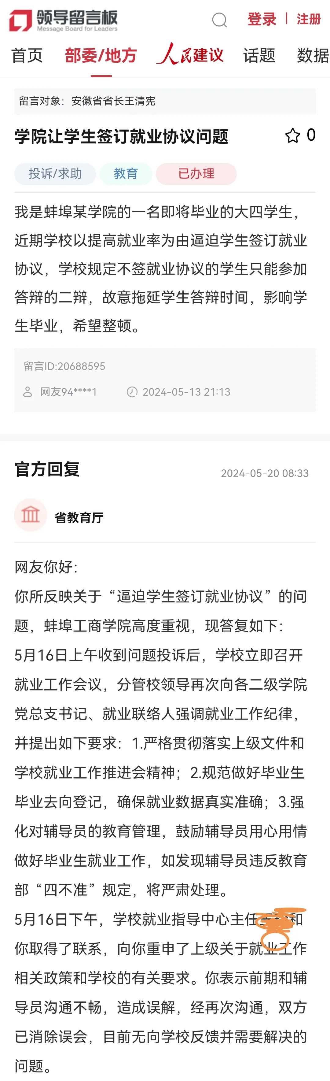 大家好啊!我来跟大家聊聊最近在蚌埠某个学院发生的一件很让人头疼的事儿。据说这几周以来,我们学院为了让自己看起来就业情况良好,竟然强迫我们这些马上就要毕业的大四同学们签署就业协议。如果你不签的话,那就只能参加第二次答辩啦,而且还得等上好久才能拿到毕业证呢。这种做法真的太过分了,所以我想请大家帮忙关注一下这个事情,看看能不能帮我们解决一下这个问题。#蚌埠身边事# #蚌埠头条# #蚌埠# #安徽头条# #安徽身边事# #安徽# 官方回应时间是2024年5月20日早上8点半哦,安徽省教育厅的朋友们已经给出了他们的看法。他们说,他们非常重视我们反映的“逼迫学生签订就业协议”的问题,并且已经开始采取行动了。他们在收到我们的投诉之后,立刻就开了个就业工作会议,还特别提醒了各个二级学院的党总支书记和就业联络人要遵守就业工作的纪律。他们还提出了三个具体的要求:首先,要严格执行上级的文件和学校的就业工作推进会的精神;其次,要规范地做好毕业生的毕业去向登记,保证就业数据的真实性和准确性;最后,要加强对辅导员的教育和管理,鼓励他们用心用情地帮助毕业生找到合适的工作。他们还说,如果发现有辅导员违反教育部的“四不准”规定,他们将会严肃处理。然后呢,就在5月16日下午,学校的就业指导中心主任还特意打电话给我,向我重申了上级关于就业工作的相关政策和学校的相关要求。他说,之前可能是我和辅导员之间的沟通出现了问题,导致产生了一些误解。经过再次沟通,现在我们已经消除了误会,没有什么问题需要再向学校反馈或者解决了。