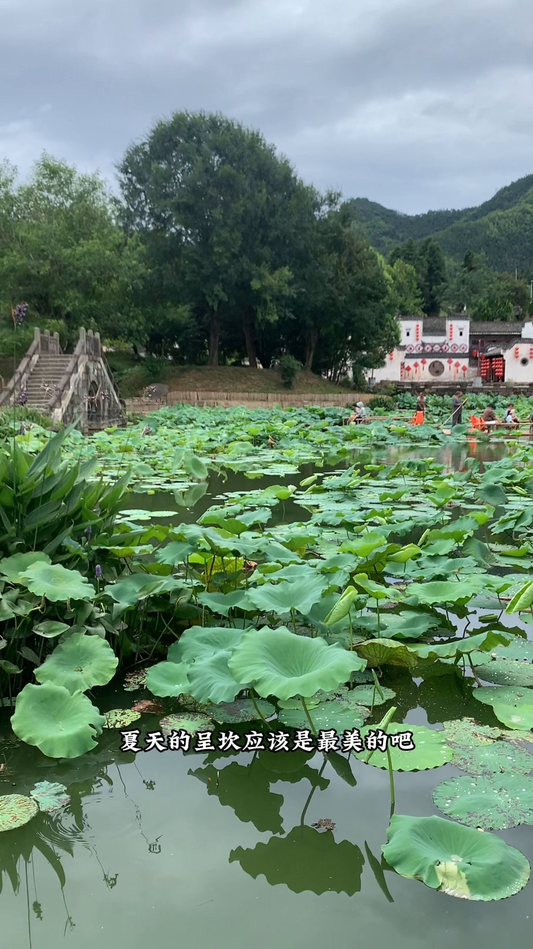 3. 这是这个地方的核心景区永兴湖,它的湖面上栽种了成片的荷花,你可以在岸边找一个美景坐下来好好欣赏,也可以选择坐竹筏。这里还有好多网红鹅。现在我走的这个桥叫做平安坎,呈坎古镇的标志性建筑,它的寓意是过坎有鱼,平安得福。据说这也是呈坎古镇的迷阵入口。