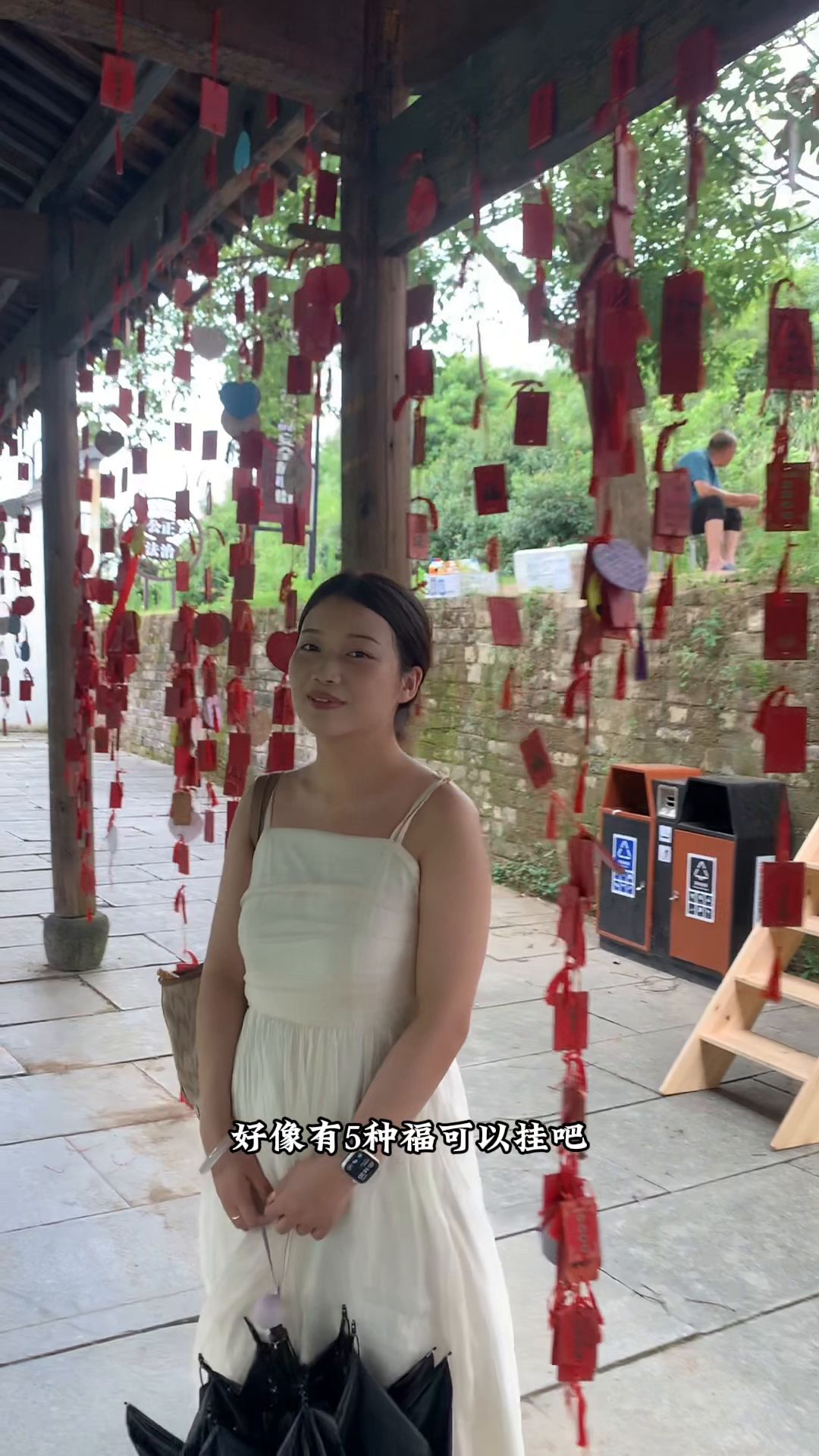 5. 永兴湖的上面就是晒秋广场了,这个地方比较适合秋天来打卡。看宣传图上,秋天广场上都会放玉米、辣椒、各种食物。这会真的走累了,我们在这个树下坐了会,看了会风景。八卦门居然在景区的外面,这就是我刚刚说的晒秋,还蛮美的。