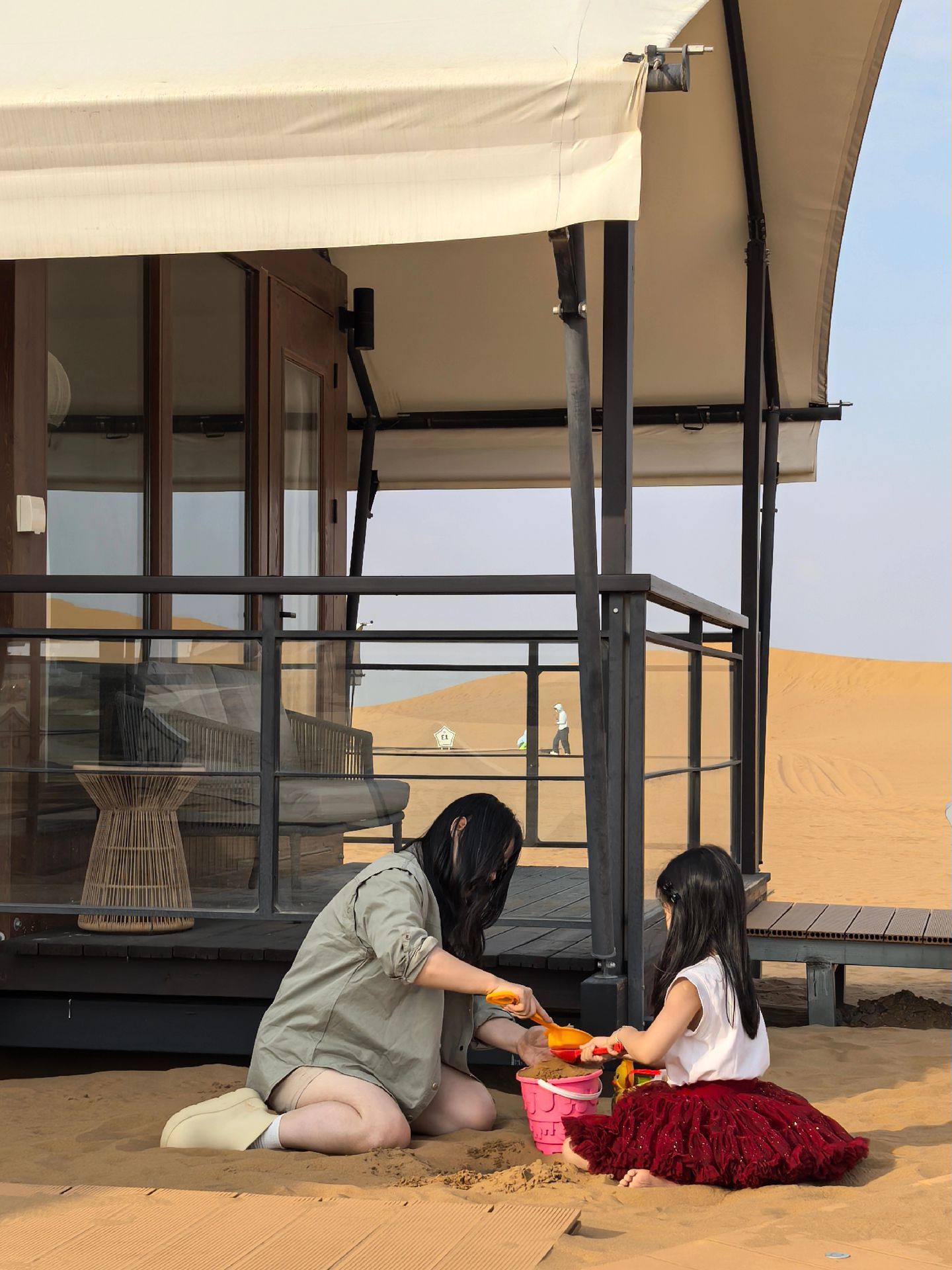 星星酒店:我们入住的是A区沙景独栋木屋,一眼望去就是一望无际的沙子,娃直接钻进沙子里都不想出来了