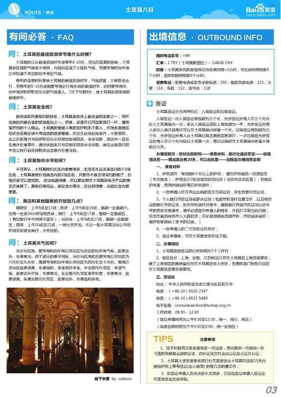 提示:旅客到土耳其旅游,要记得带上一件轻便的衣服,冬季不要忘了带上毛衣、手套和雨衣,以备所需之时用。
