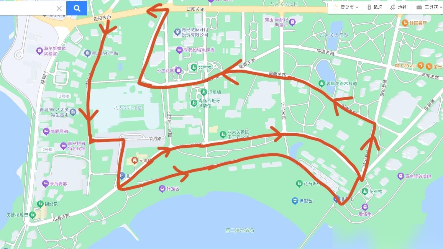 出发点选在八大关小礼堂的停车场,出门之后,穿过山海关路,来到第二海水浴场的海边,经过整个沙滩之后,来到这个深到海里的防波堤之后,经过花石楼,回到山海关路。一直走到正阳关二支路右拐到居庸关路打卡公主楼之后,最后经过正阳关路回到山海关路,最终返回停车场。