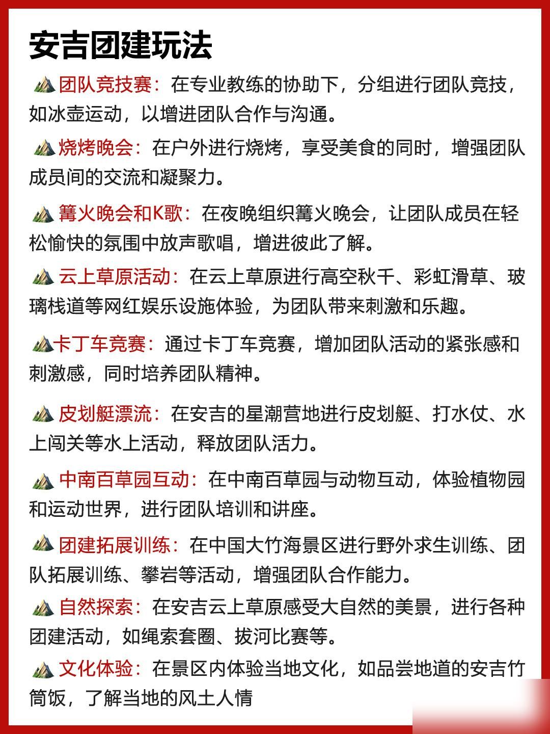 玩法:竹林漫步、峡谷探险、瀑布观赏、主题乐园、登山观星、亲近动物、竹文化体验、户外露营、团队竞技赛、烧烤晚会、篝火晚会和K歌、云上草原活动、卡丁车竞赛、皮划艇漂流、团建拓展训练、自然探索、文化体验