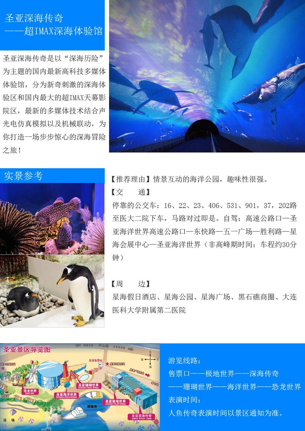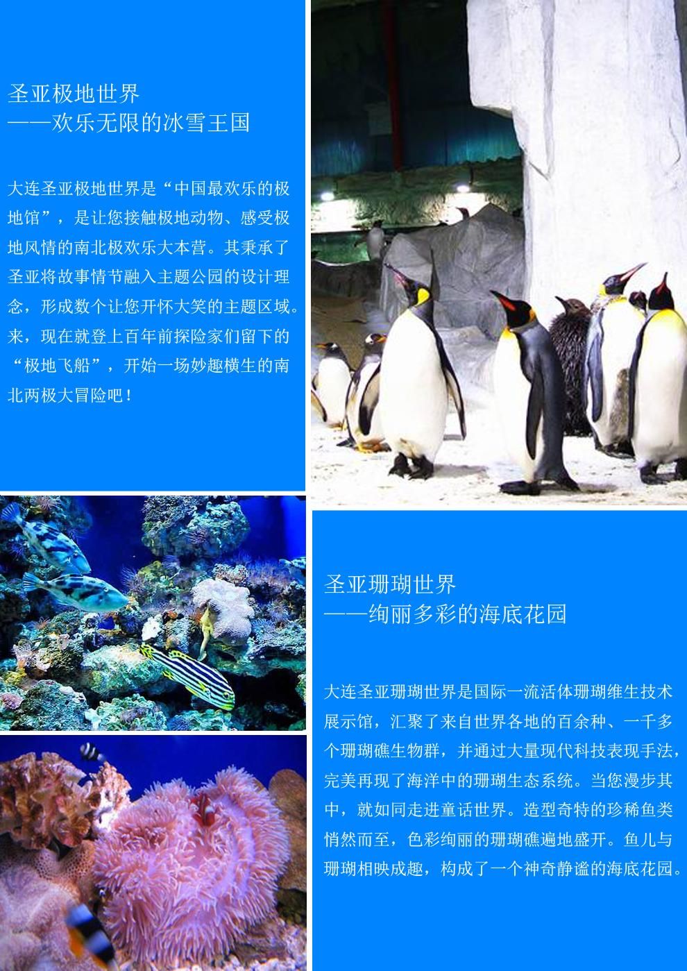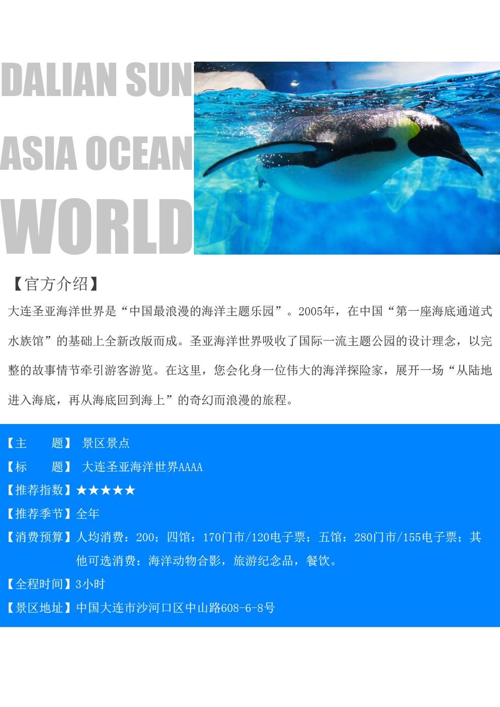 大连圣亚海洋世界是“中国最浪漫的海洋主题乐园”。2005年,在中国“第一座海底通道式水族馆”的基础上全新改版而成。圣亚海洋世界吸收了国际一流主题公园的设计理念,以完整的故事情节牵引游客游览。在这里,您会化身一位伟大的海洋探险家,展开一场“从陆地进入海底,再从海底回到海上”的奇幻而浪漫的旅程。