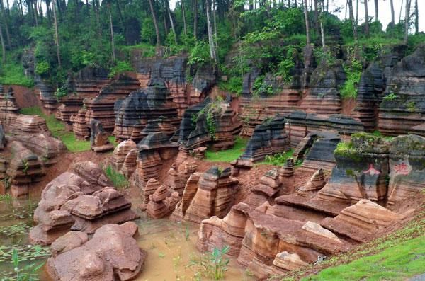 红石林是一个典型的喀斯特地貌群,而且十分有特色,可以在游玩芙蓉镇结束之后包车前往这里,两者相隔15公里的路程,原本是奥陶纪的海底,后来经过雨水的冲刷就形成了独具特色的喀斯特地貌,因为含有铁元素又有点丹霞地貌的感觉,进入景区就能看到色彩鲜艳、造型奇异的奇峰怪石,大自然真是神奇。