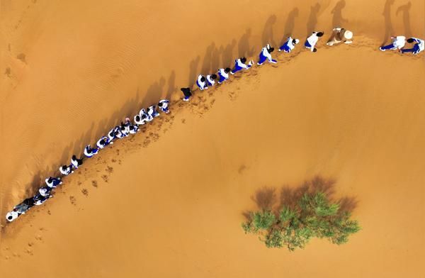 在专业指导老师的带领下,学生们首先进行了沙漠徒步,亲身体验了沙漠的自然环境。随后,他们参与了扎草方格的实践活动,这是一种有效的固沙方法,通过在沙地上铺设草方格来固定沙土,防止风蚀。