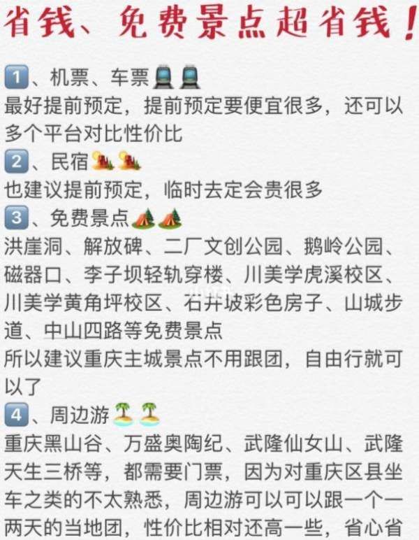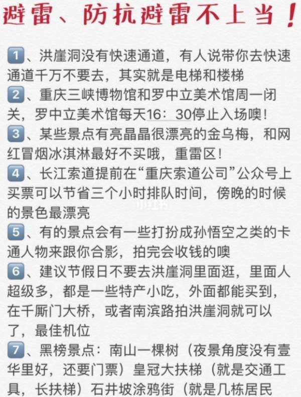 注意事项:重庆的天气情况变幻莫测,一天内就可能出现春夏秋冬四季的体感,提前看天气预报,然后携带外套,以备不时之需。有可能秋季也是阳光狠辣,或者突然下雨,所以携带一把伞是很有必要的。