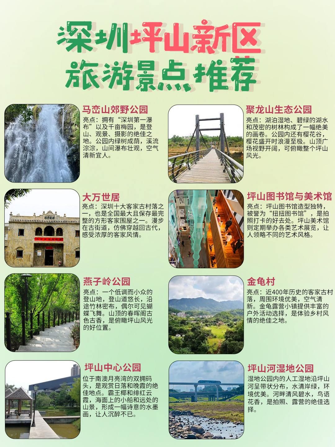 亮点:坪山图书馆造型独特,被誉为“扭扭图书馆”,是拍照打卡的好去处。坪山美术馆则定期举办各类艺术展览,让人领略不同的艺术风格。