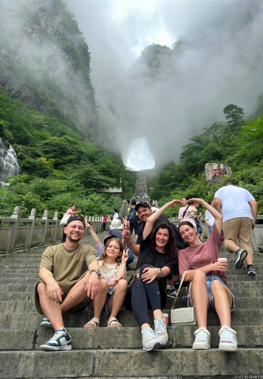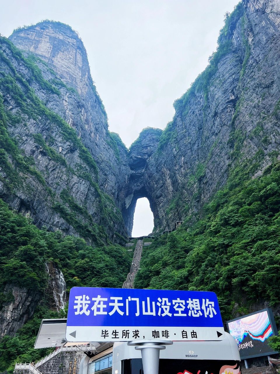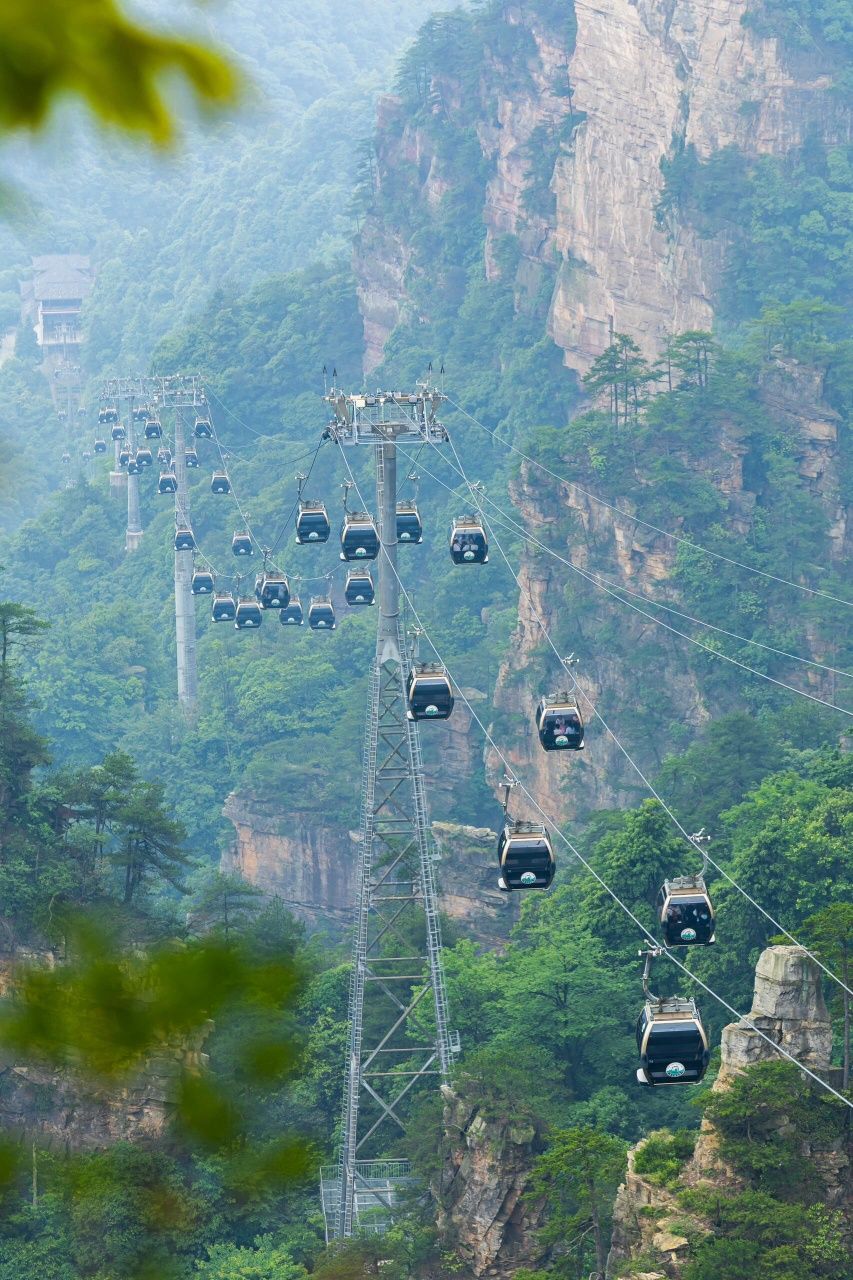 12 点来到天门山索道站排队,13 点 30 分终于排到我们,坐上了缆车。缆车全程观景上山,可以看到云雾缭绕的天门山,而且一点也不恐高。一车厢 8 个人都在惊叹景色太美了!