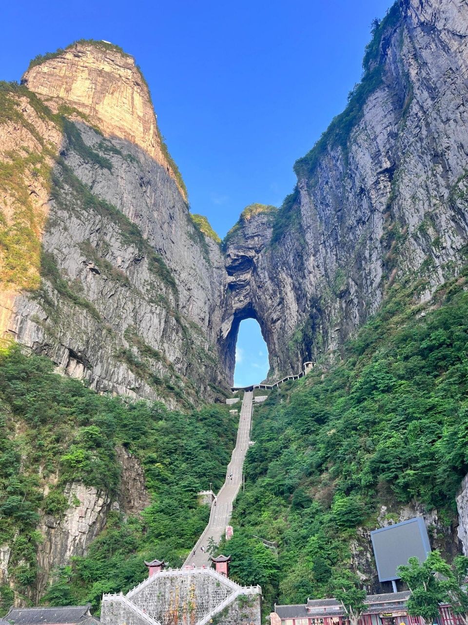 17 点到达天门洞,太累了没力气,就在洞口吃了点东西休息。17 点 30 分下天梯,超级陡,超级腿软!18 点 20 分在天梯楼下的香炉烧了香,然后在网红机位打卡拍照。