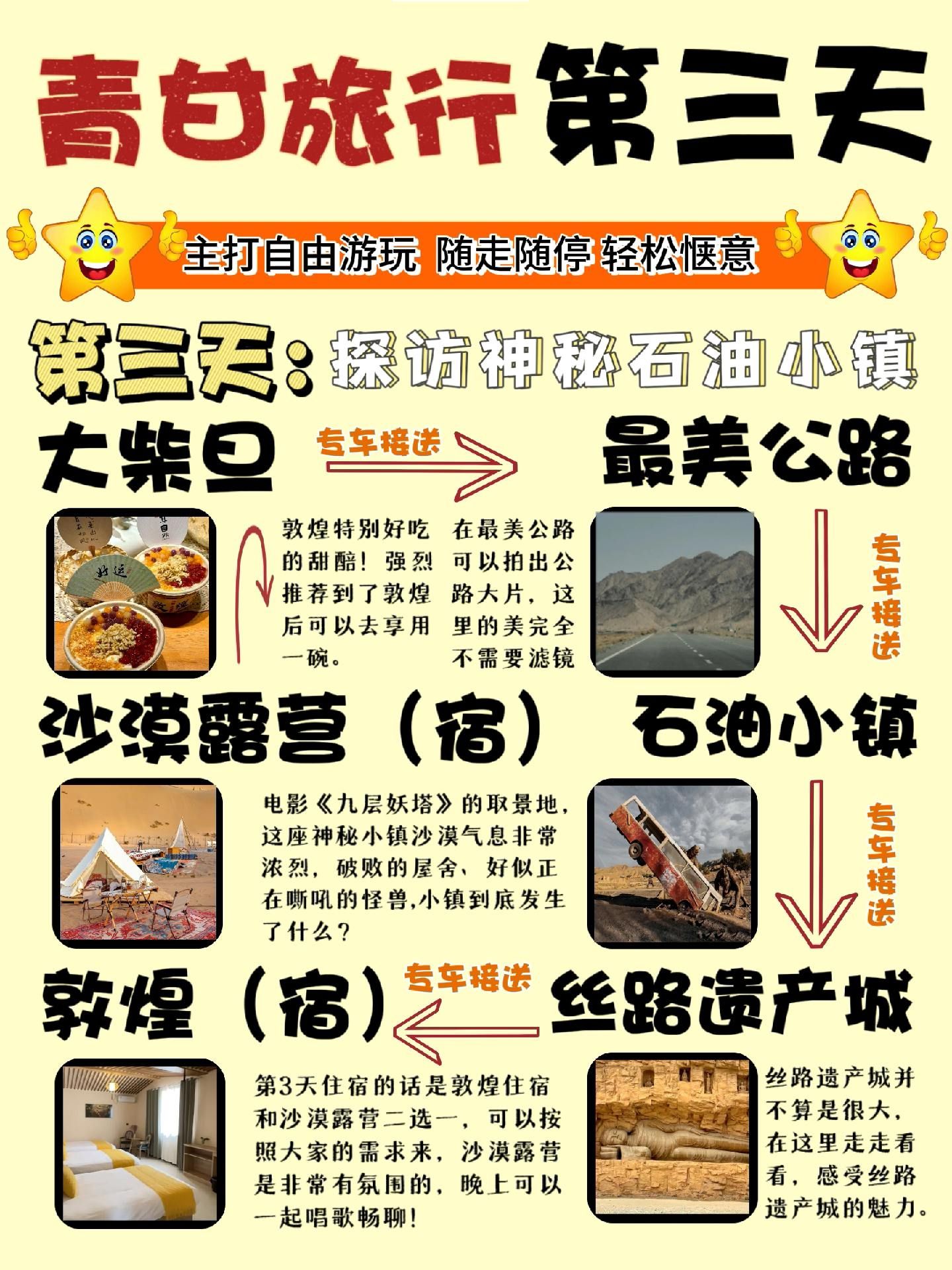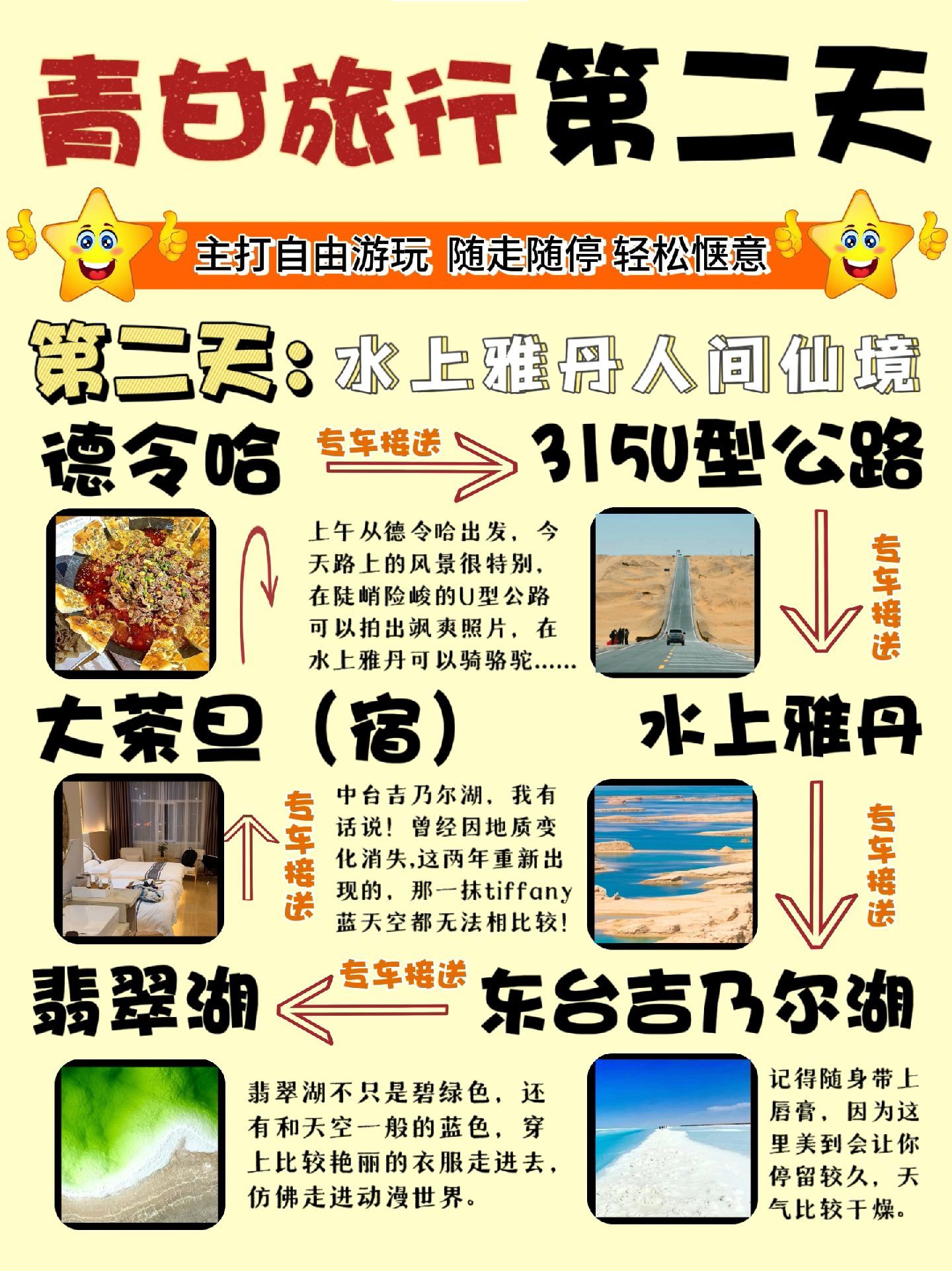 D2德令哈.—315U型公路—水上雅丹—东台吉乃尔湖—翡翠湖—大柴旦(宿)D3.大柴旦—最美公路—石油小镇—丝路遗产城—沙漠露营或敦煌(宿)
