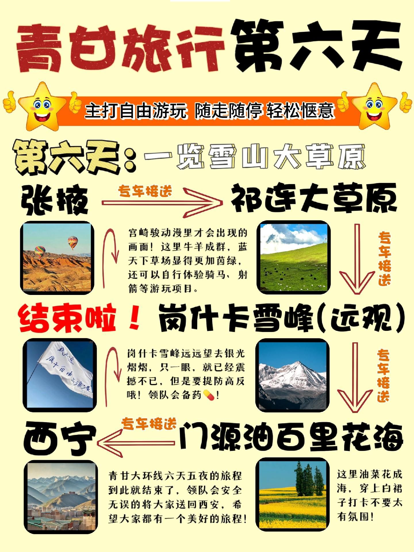 D6.张掖—祁连大草原—岗什卡雪峰(远观)—门源油菜花(花季)—西宁
