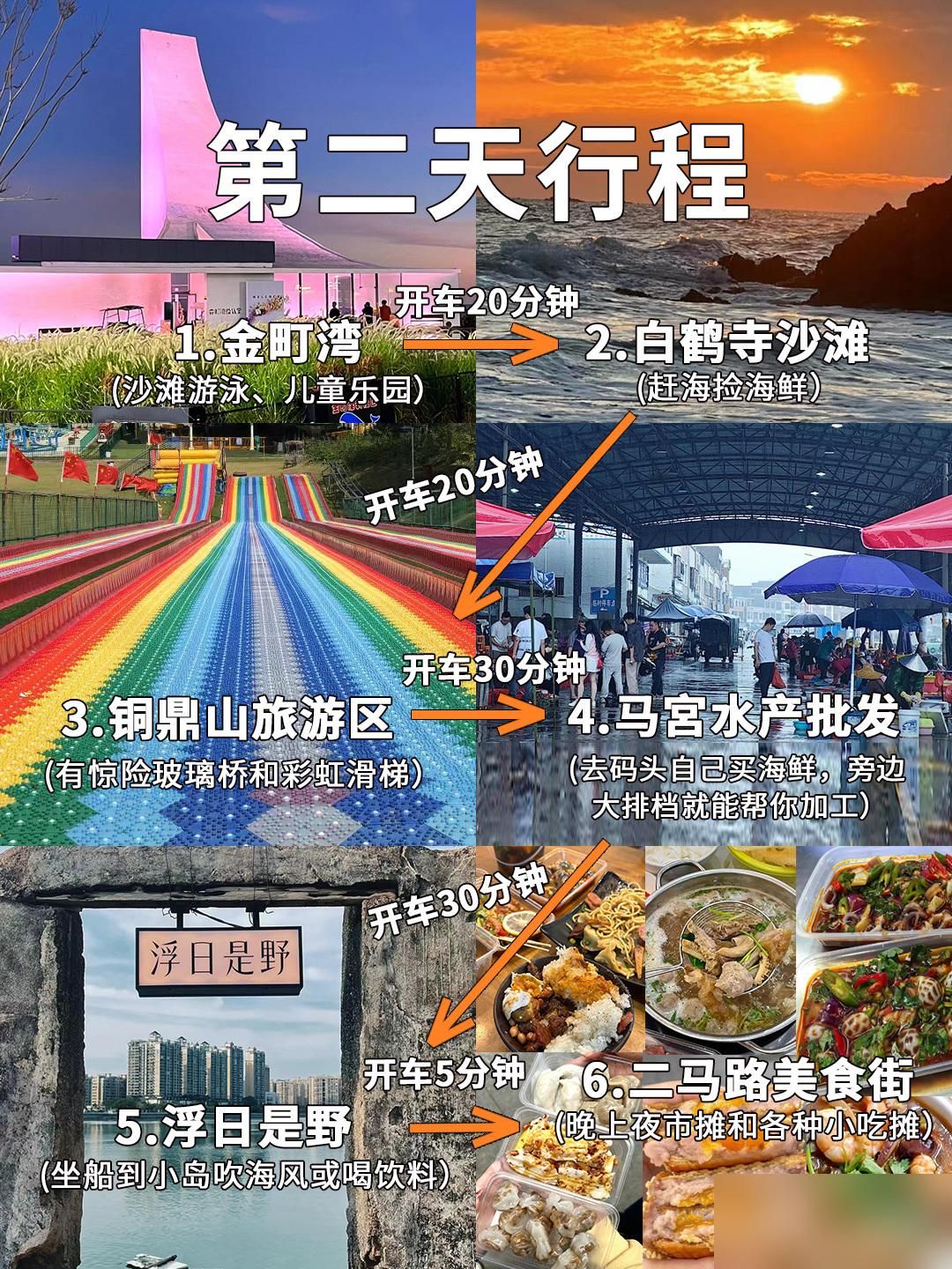 第二天:晨洲村金町湾白鹤寺沙滩铜鼎山旅游区马宮水产批发浮日是野二马路美食街