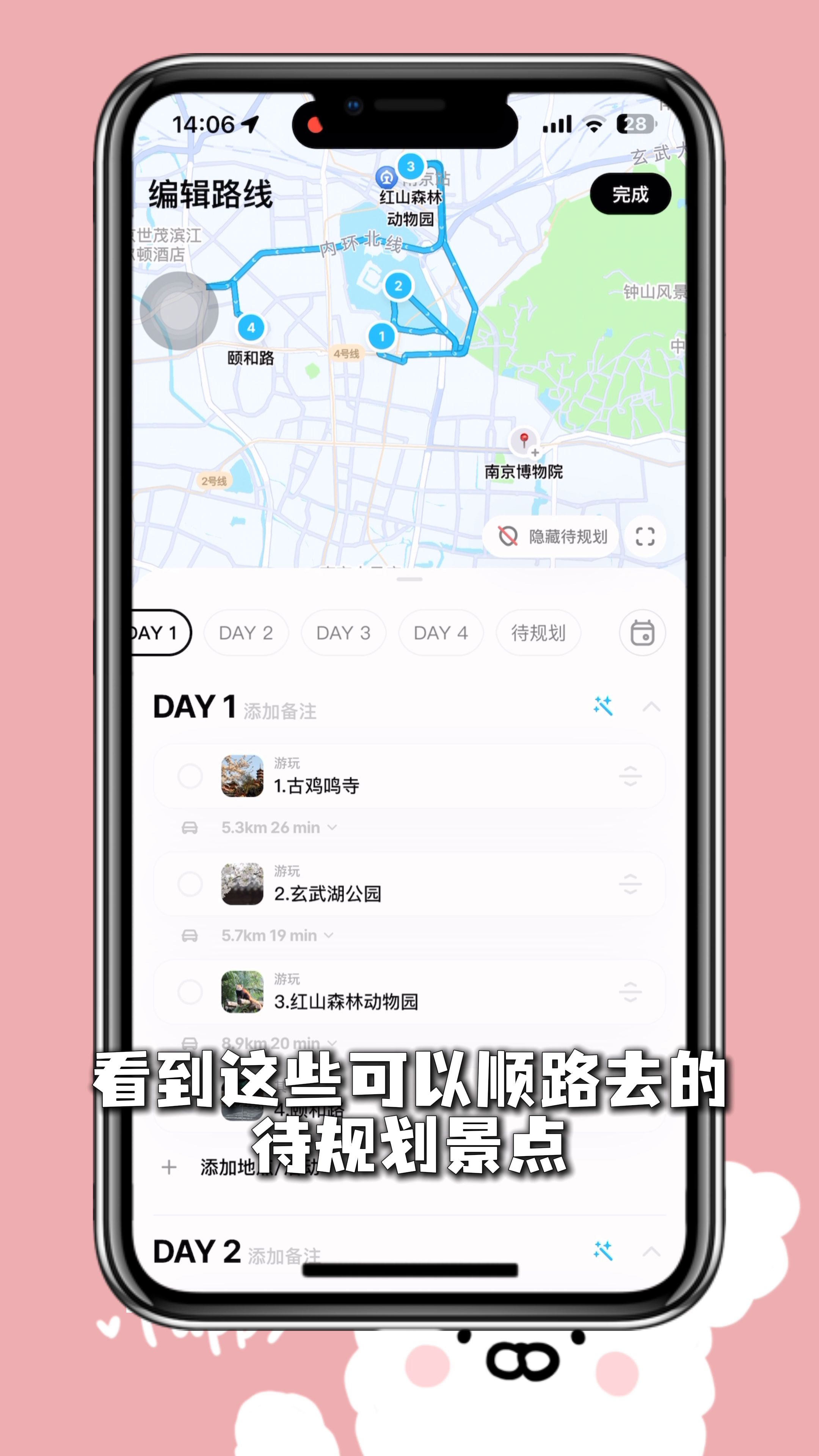 4. 游玩顺序根据景点距离顺路规划,可编辑路线顺序调整出发点,它会根据新起点重新调整路线,也可挪动景点或修改行程天数,没安排但收藏的景点可放进待规划,能在地图上看到可顺路去的待规划景点增加可玩性。