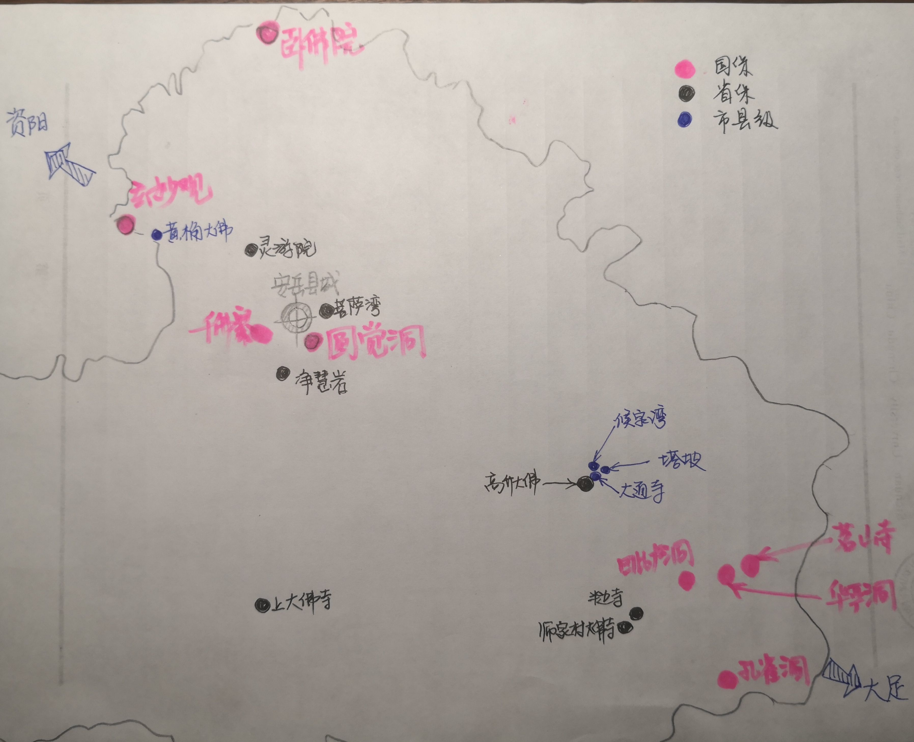 手绘一张安岳石刻精华,分布大差不差,供参考。