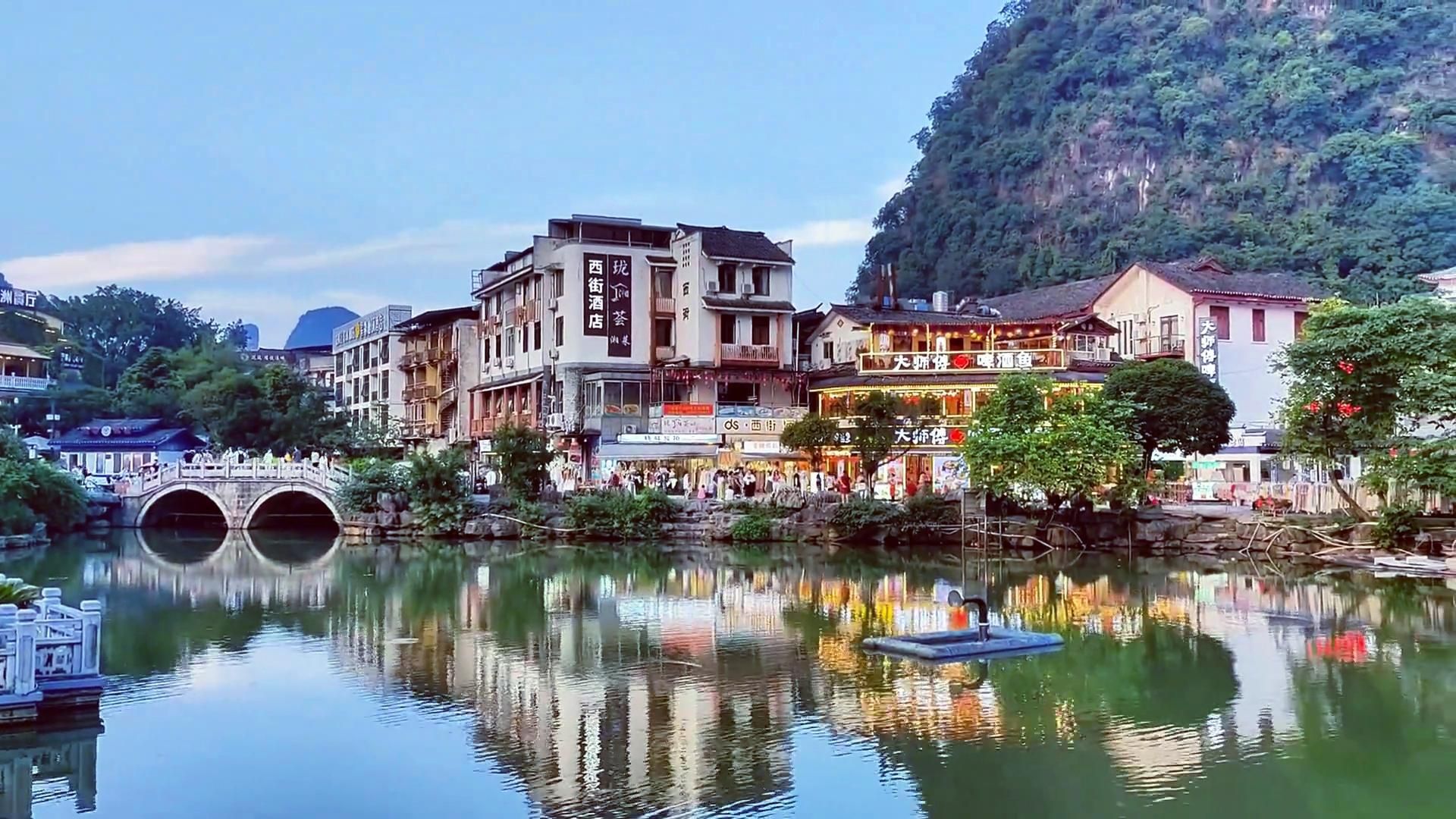位于阳朔的中心,每一个来桂林旅游的人,都绕不过阳朔的西街,这种向往的情怀,来源于它古老的历史,也是心中的那份期盼。小青瓦,坡屋顶,木门窗,吊阳台,透着一份古朴典雅和岁月的故事。鳞次栉比的民宿,咖啡馆,酒吧,餐厅,不同元素的商铺让这里充满了繁华,这便是阳朔西街,它既古老又年轻。西街的尽头就是漓江,这里的风景也独美,后面街道是霓虹闪烁风情万种,这里却是青山如黛草如烟,江阔云低风欲眠。吹来的江风,如同高度白酒,醉人醉心,让人不觉间想要停下来歇息。