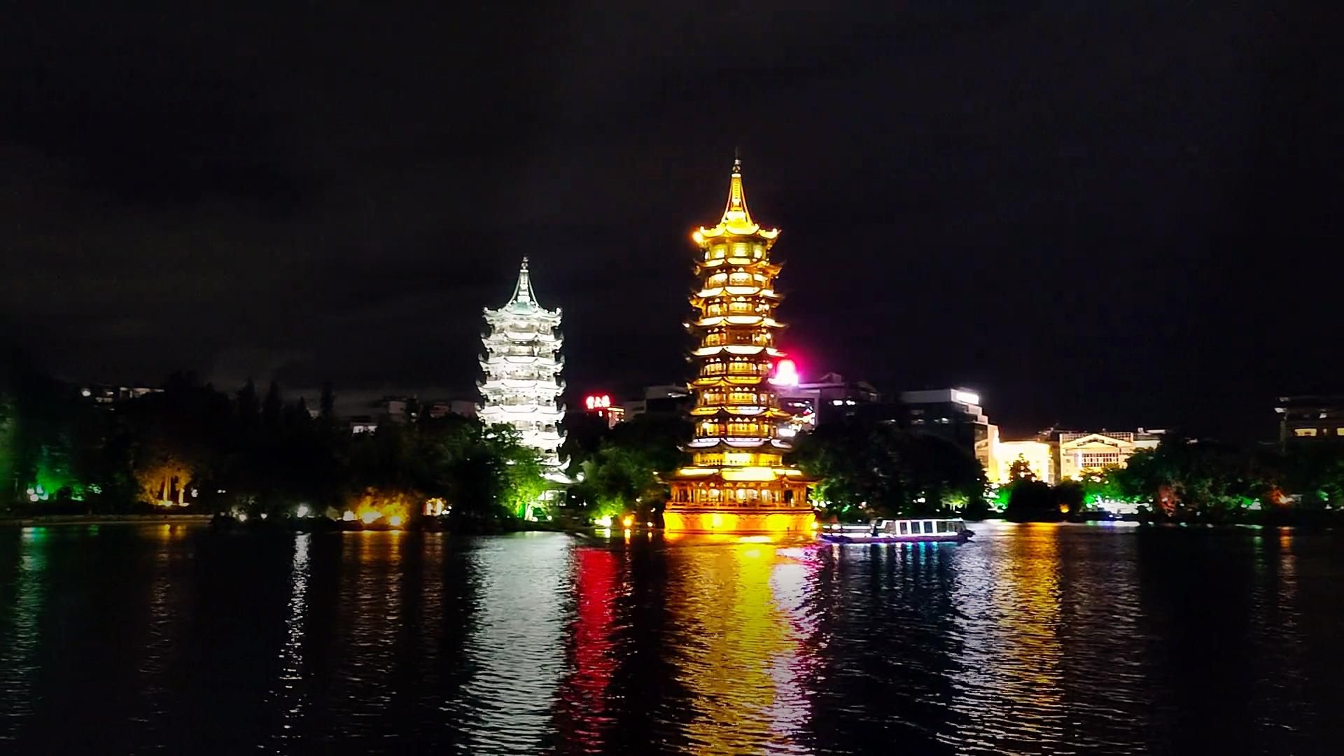 位于桂林的市中心,作为桂林的标志性建筑。日塔高41米,九层八角黄铜建造。月塔高35米,七层八角琉璃建造。日月双塔,一塔映日,一塔浮月。在灯光的映衬下,精美的装饰,日塔金碧辉煌,珞珞如石;月塔洁白如玉,温婉秀美。恰好倒映静谧的湖中,与周围的建筑和山水一起,美得令人窒息,如梦似幻。