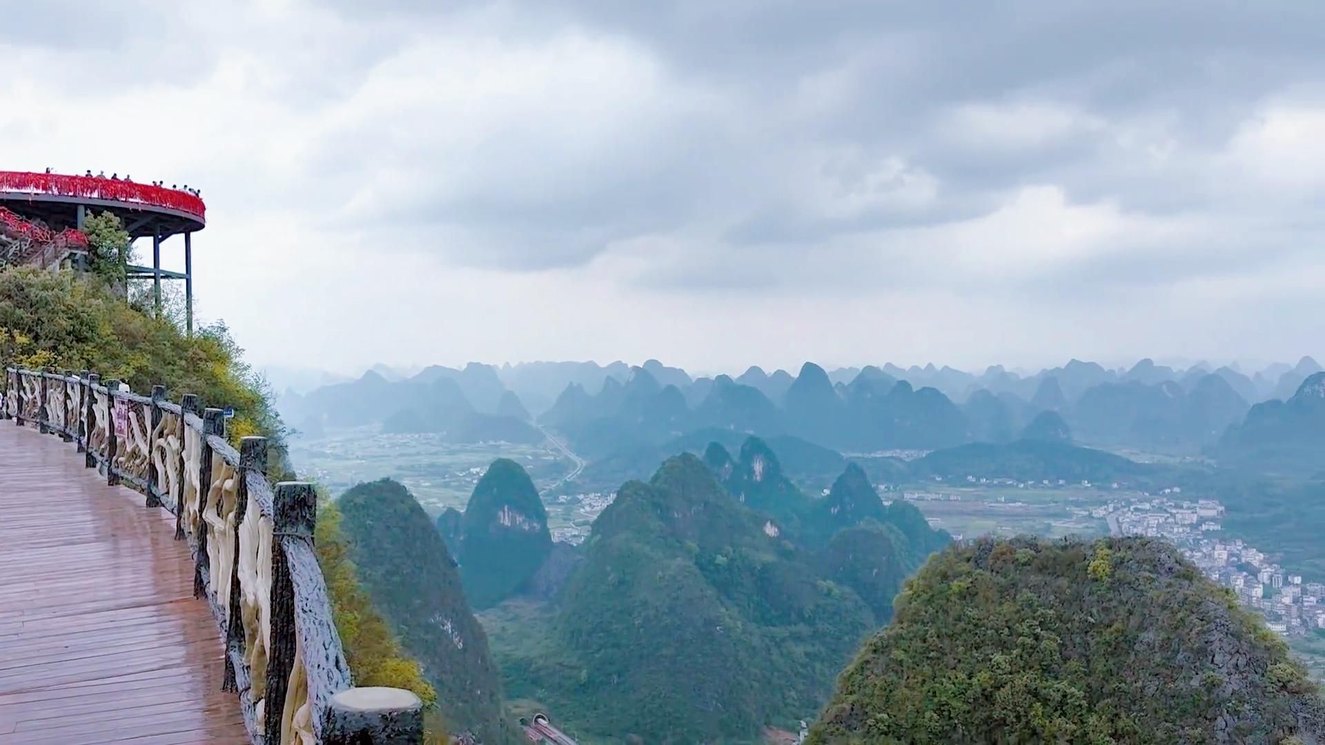 距离阳朔西街大约15公里,由元宝峰,如意峰等天然喀斯特峰林景观和索道索桥,云顶观景台,玻璃栈道等创意景观共同组成。全长2000多米的索道,垂直高度达到242米,随着缆车的移动,穿过森林,越过山峰,欣赏着四周的自然风光。如意峰顶的360度观景平台,开阔的视野,居高临下的视角,阳朔喀斯特峰林景观和田园风光全部映入眼。如果说日出日落是用光迷惑了您的眼,那如意峰上的云海,它就是以山峦天地为布,描绘出了山河的壮阔,画出了桂林的水墨仙境。