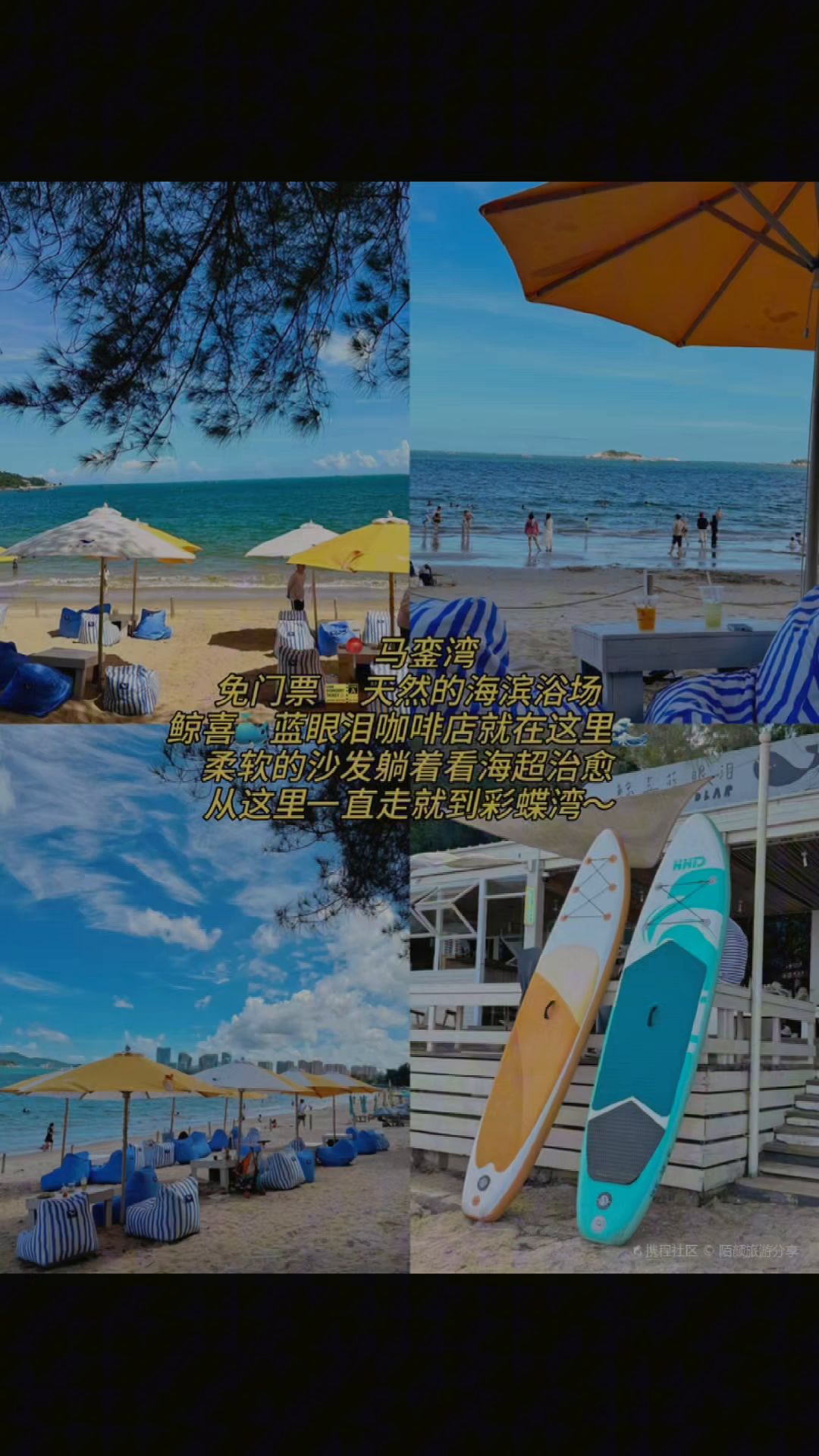 3. 《你的婚礼》拍摄地,退潮后沙滩才会显现,免门票的天然海滨浴场,鲸喜蓝眼泪咖啡店就在这里,柔软的沙发躺着看海超治愈,从这里一直走就到彩蝶湾,素有天空之境、镜面沙滩美称,有篝火晚会、烧烤娱乐、赶海,沙子细腻柔软一望无际的大海,免门票多巴胺配色很治愈,这里还有网红小火车、好玩的游乐园和海上项目,是亲子游玩的度假天堂。