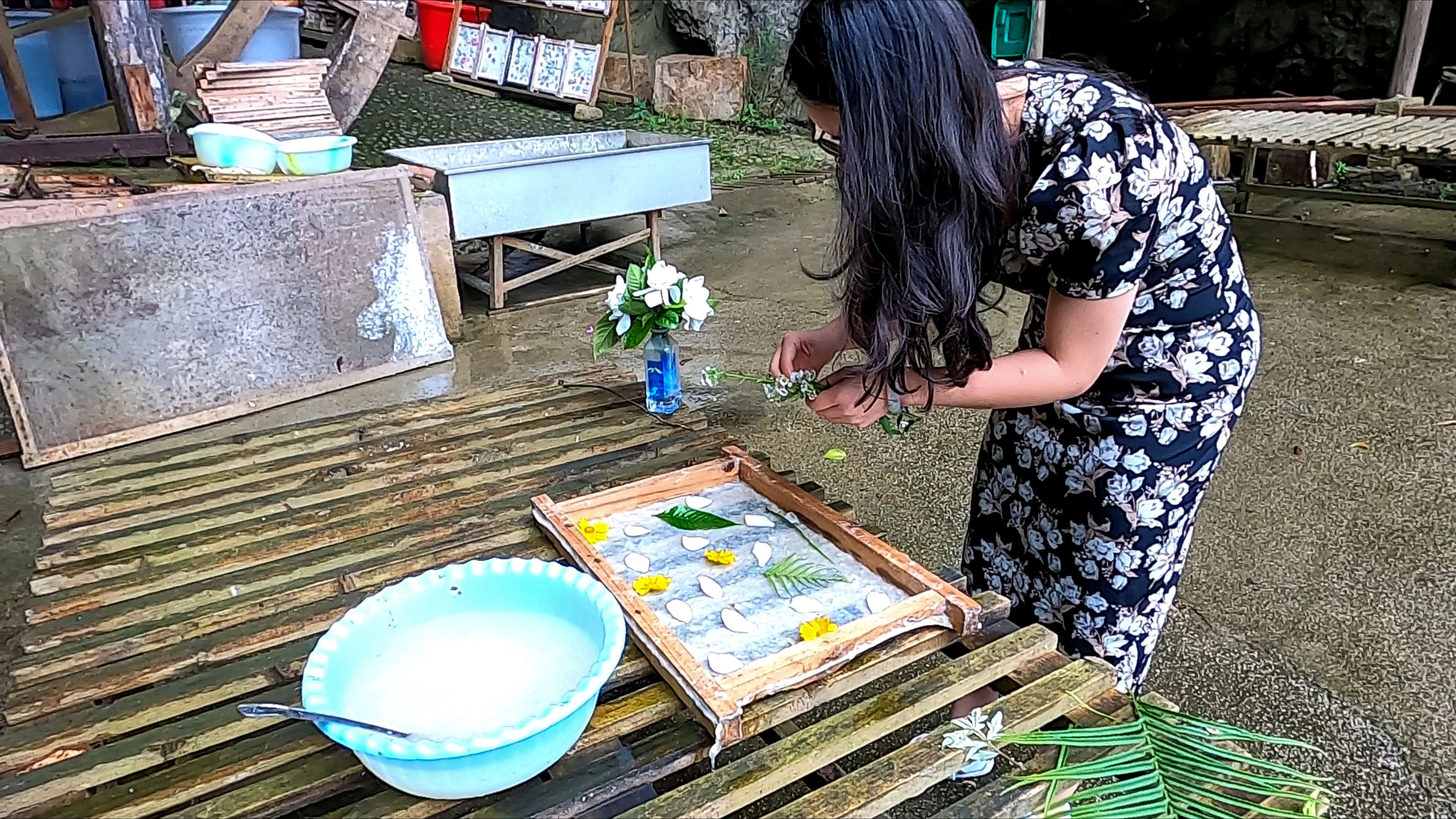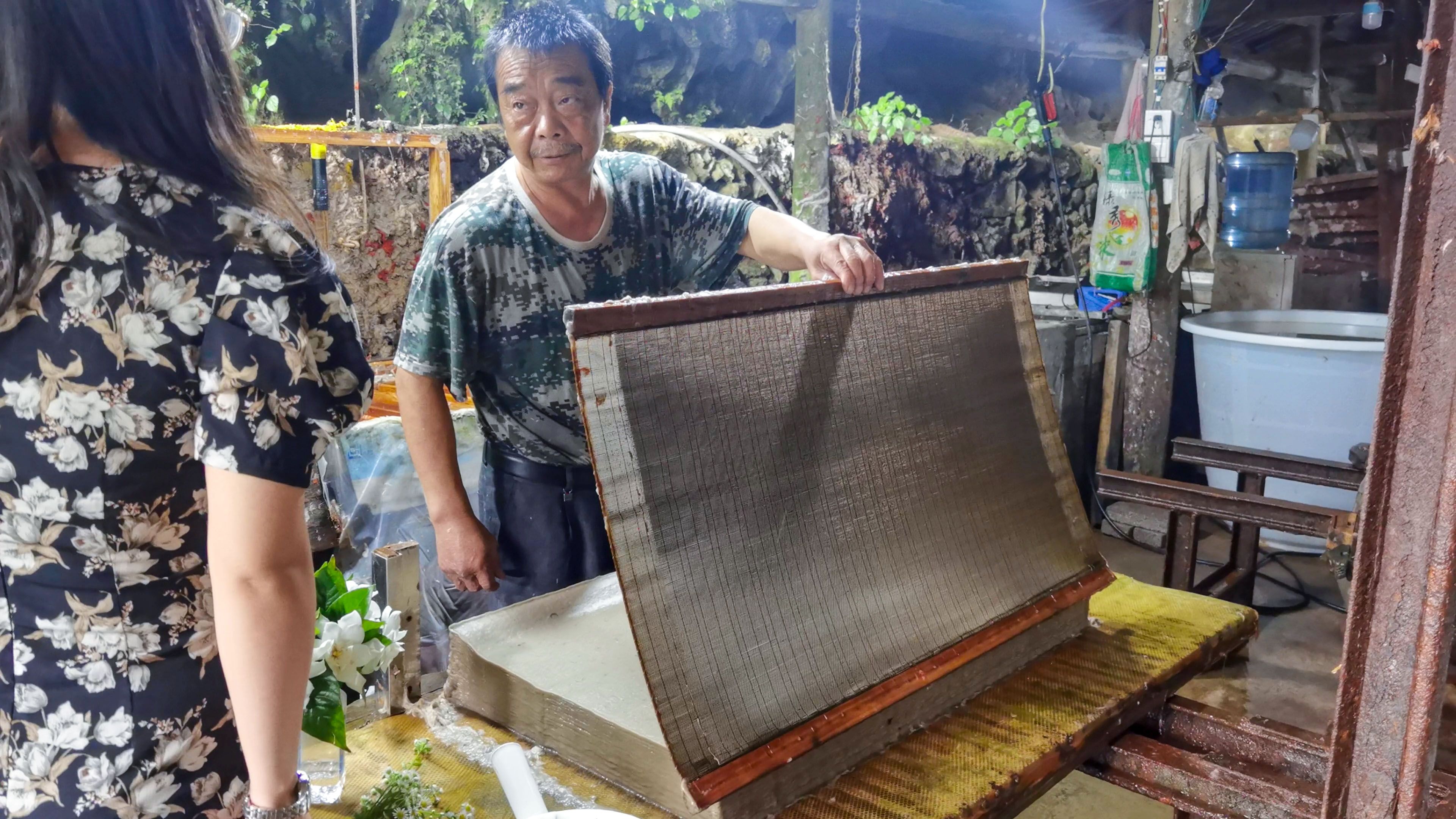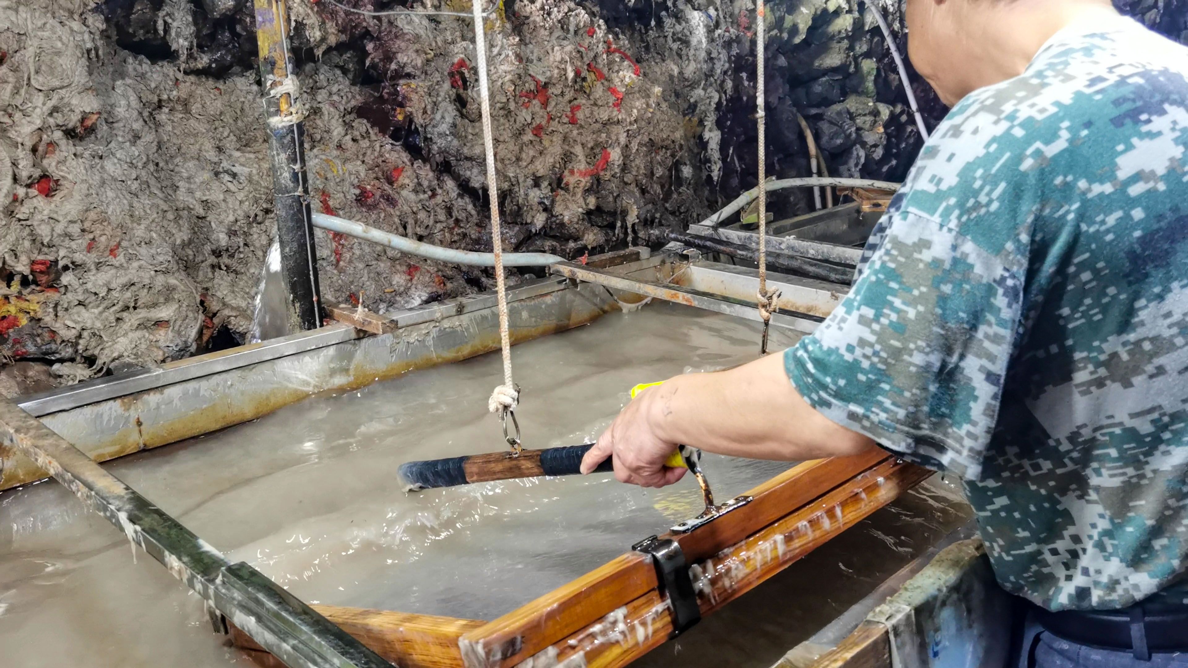 接着,就是抄纸的绝技了,匠人们手法轻巧,仿佛在给纸浆做SPA,一张张湿润的纸张就这么魔术般地被创造出来,看得我是目瞪口呆!