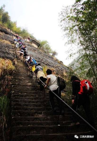 最惊险的一段山路莫过于垂直80度“铁索云梯”。仰视一条铁索悬挂绝壁之中,垂直角度大约有80度。游客攀援而上,需手足并用,十分小心,爬上去之后再往下看,不禁让人倒吸一口凉气!