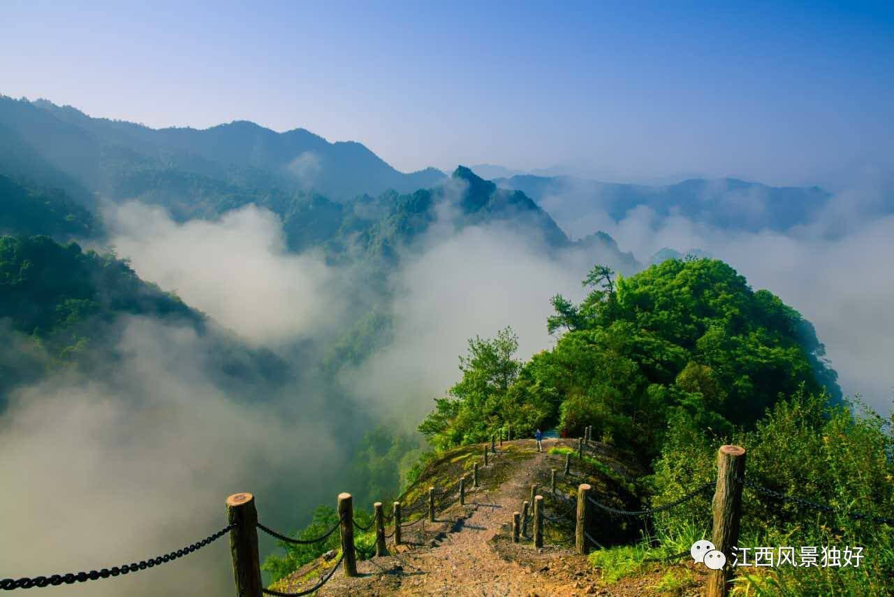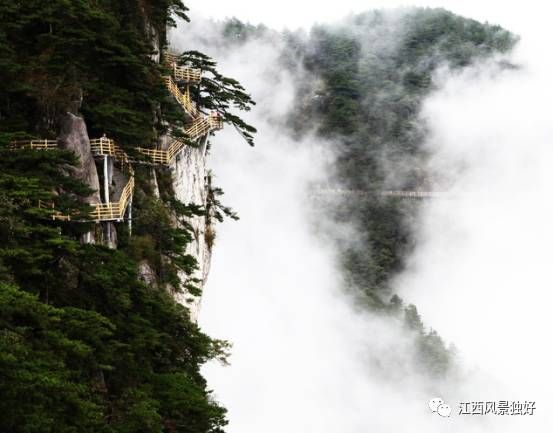 江西宜春明月山青云栈道,“绝壁览胜”。栈道位于海拔1700米处,全场3100米左右,常年云雾缭绕,行走其上,有平步青云之感。悬空的栈道横亘于悬崖峭壁上,如盘云的游龙。