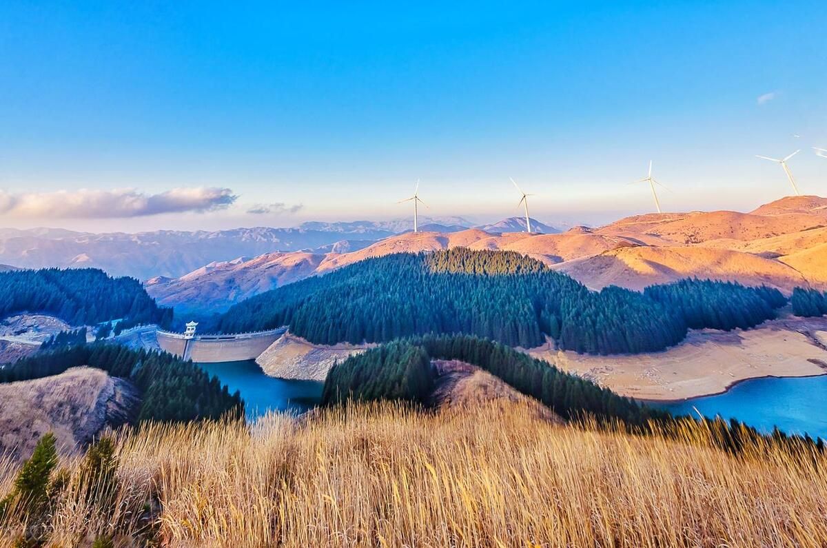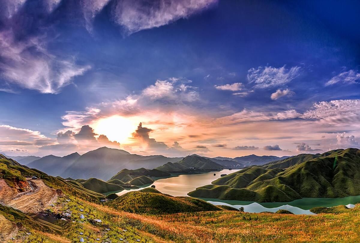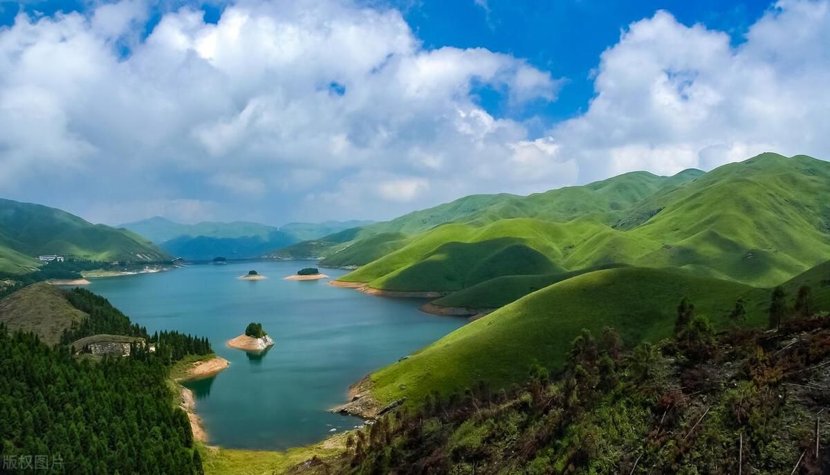 全州天湖是一处风景秀丽的水库区域,湖光山色相映成趣。湖面上,碧蓝的天空、湛蓝的湖水、蓝天白云构成了一幅美丽的画面。