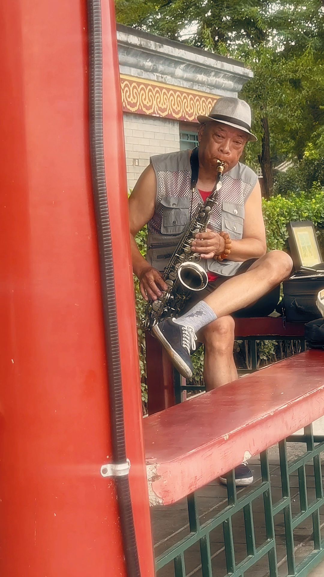 跑着跑着,看到亭子里有位老大爷在吹萨克斯,旁边有另外一个老大爷在跳舞。这位老大爷突然向我招了招手,于是我决定去做他的舞伴。我开始有些紧张,因为我压根就不会跳这种迪斯科。如果以前,我更愿意当一个观众,远远的看着这个老大爷才艺,让我仿佛就看到了他们年轻的样子。很快,我们就把这个舞池弄得沸腾起来了。