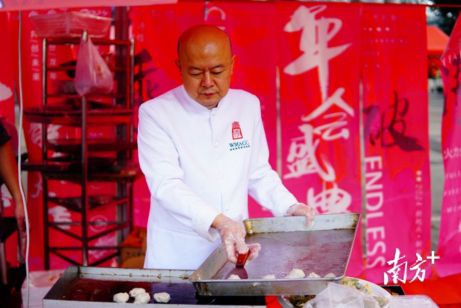 广东省粤菜师傅四星名厨、银泉酒店总经理陈建雄,正在现场烹饪小榄炸鱼球。 南方+ 苏芷妍 拍摄
