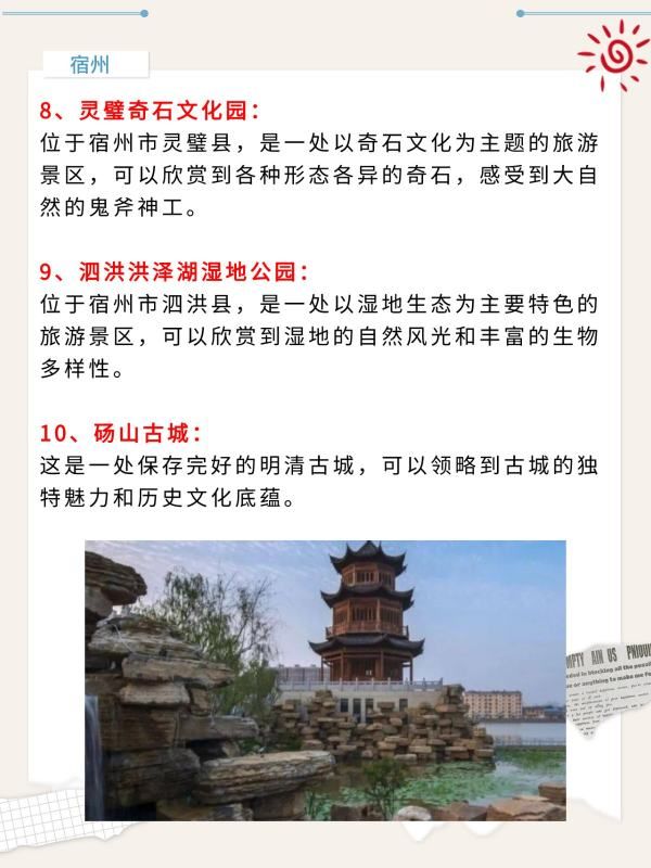除了以上景点,宿州还有许多其他的旅游景点,如灵璧古城、宿州古城墙等,每个景点都有其独特的魅力。无论你对历史文化、自然风光还是动物世界感兴趣,宿州都能给你带来不一样的旅游体验。
