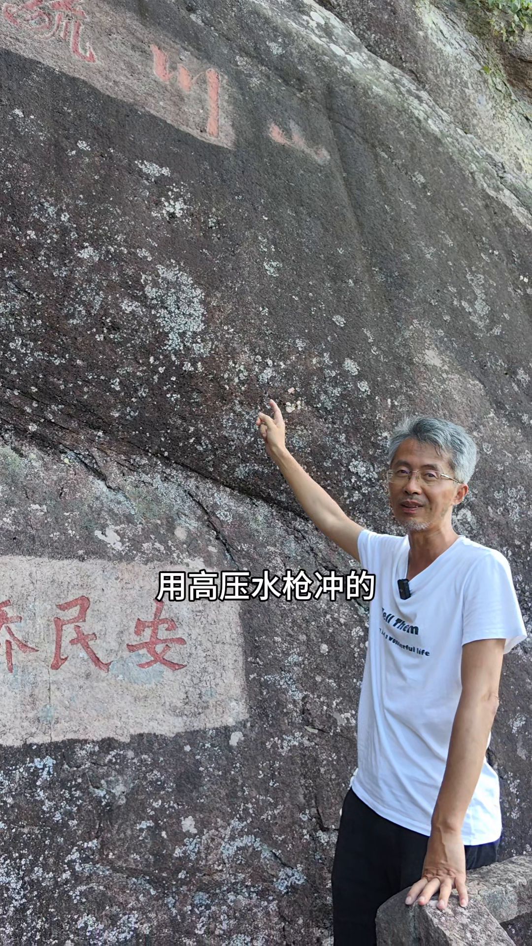 曹学佺的石刻,一个是在前一期说的姬岩那边,姬岩那边有一个来天台的石刻。另外一个石刻就是在方壶岩山川毓秀这四个字。这四个字背景的颜色之所以是这样,且没有把这四个字连起来,是因为前面说的用高压水枪冲的。因为用高压水枪冲又不把这四个字连起来,好像“山”是一个主体,“川毓秀”又是一个。